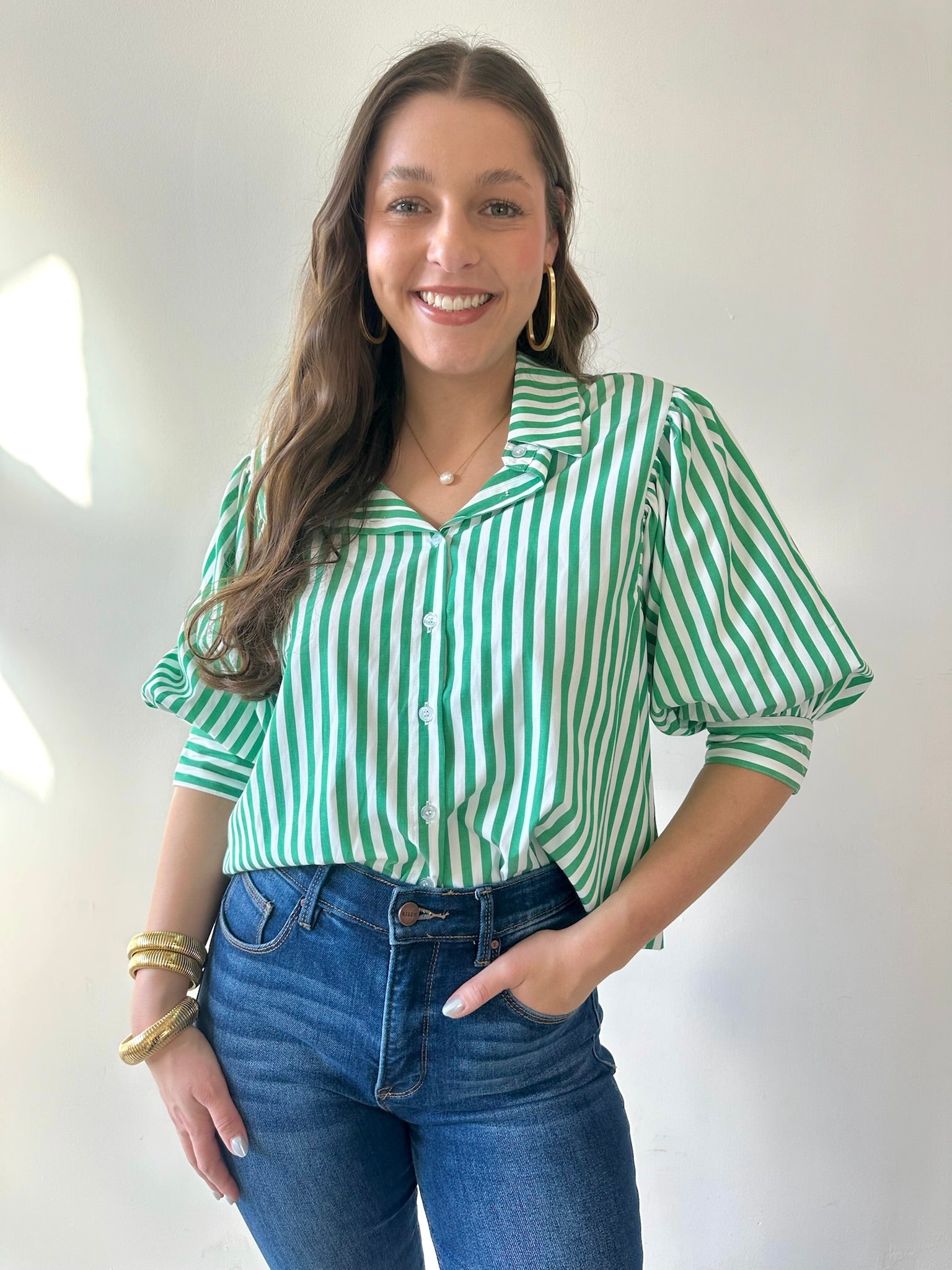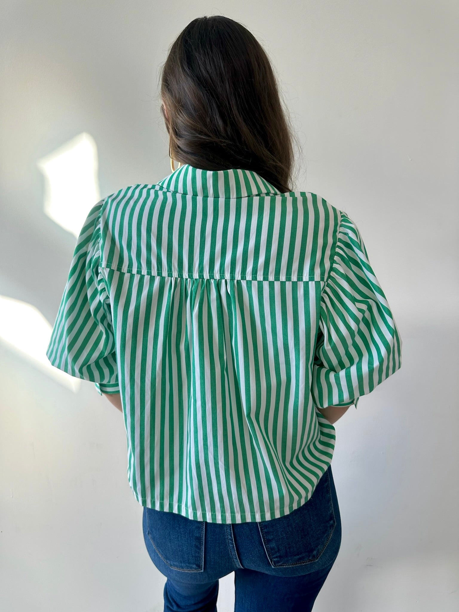 Adorable striped button-down in fresh green tones, featuring playful puff sleeves and a cropped silhouette that hits just right. The classic striped pattern pairs effortlessly with your everyday basics, while the structured puff sleeves add a touch of vintage charm. Perfect for layering or wearing solo—this piece brings personality and polish to any casual outfit.