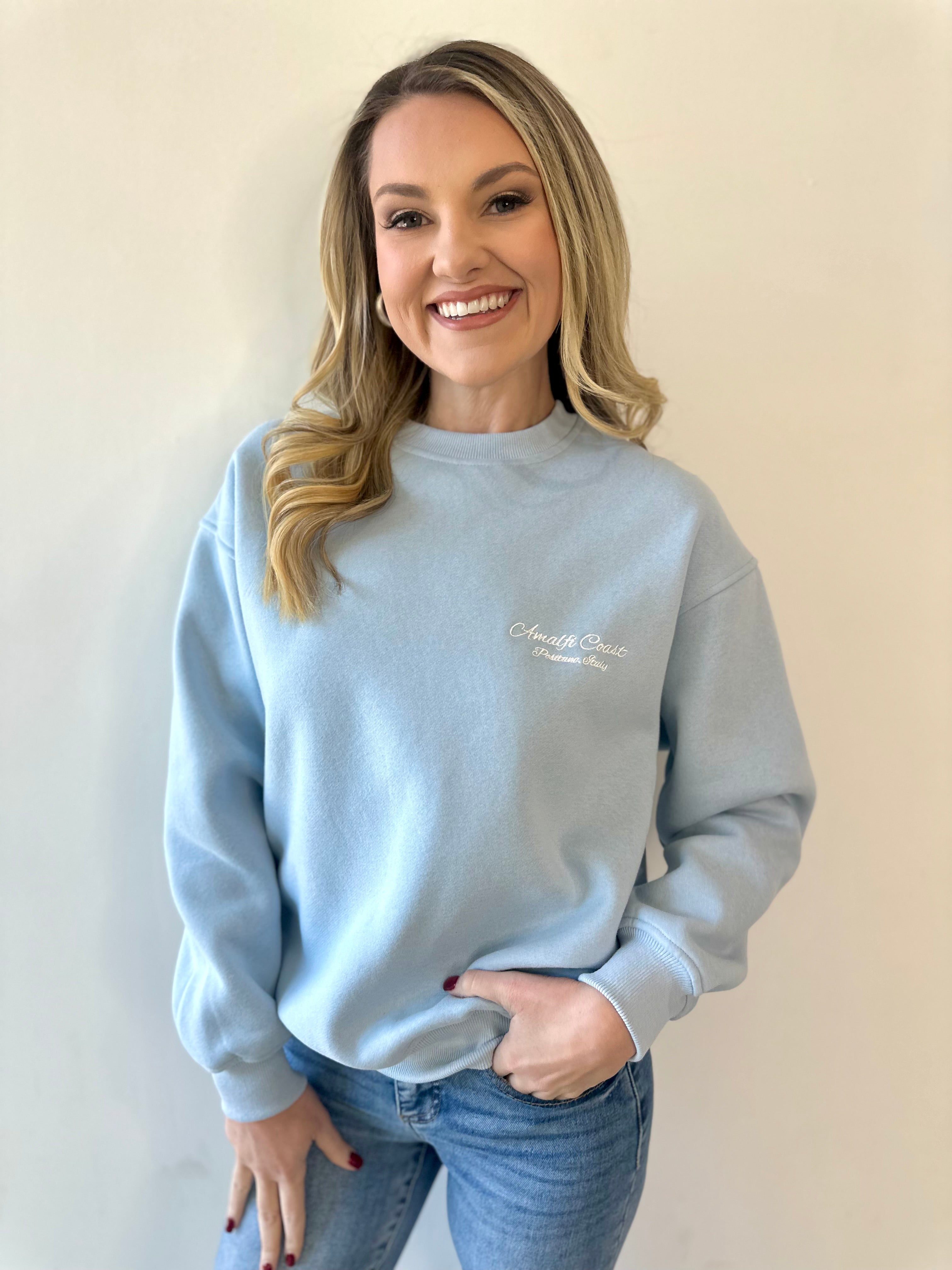 Wrap yourself in the cozy comfort of the Blue Amalfi sweatshirt—a piece that feels like a warm hug on those days when you need it most. This charming pullover combines soft, quality fabric with a timeless blue hue that pairs effortlessly with your everyday wardrobe. Perfect for layering or wearing solo, it's the kind of sweatshirt you'll reach for again and again, whether you're relaxing at home or stepping out for casual adventures.