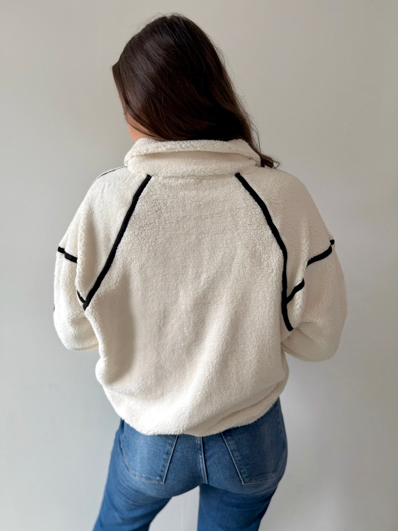 Cozy up in this Ivory Half Zip Contrast Detail Fleece Sweatshirt, featuring soft fleece fabric and charming contrast binding. The half zip with a high collar adds playful flair while keeping you snug, and elastic cuffs ensure a comfy fit. With handy front patch pockets, it’s perfect for keeping small essentials close or warming your hands on chilly days.