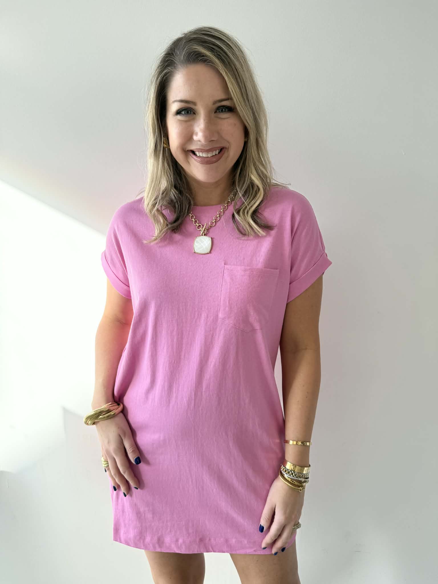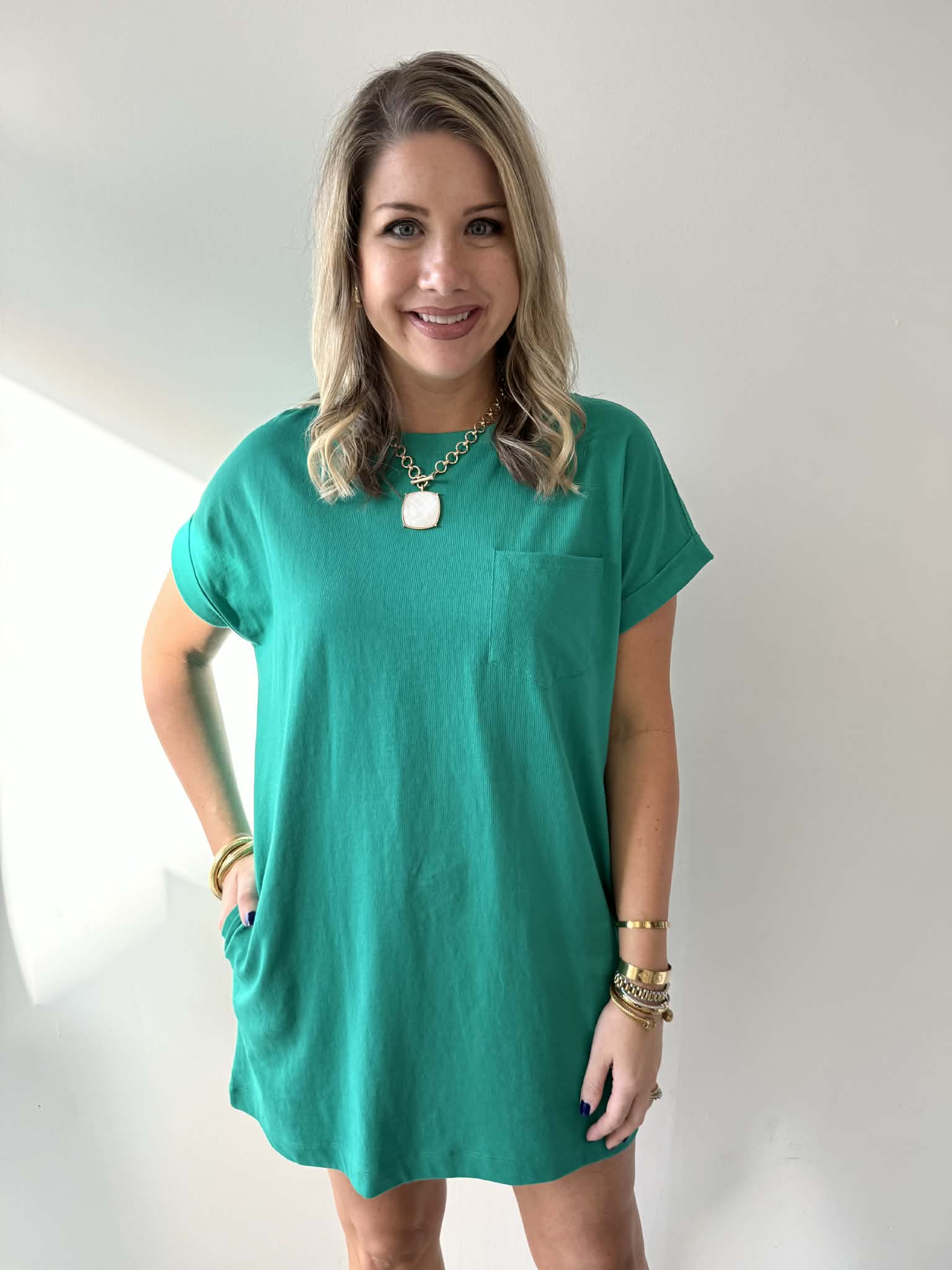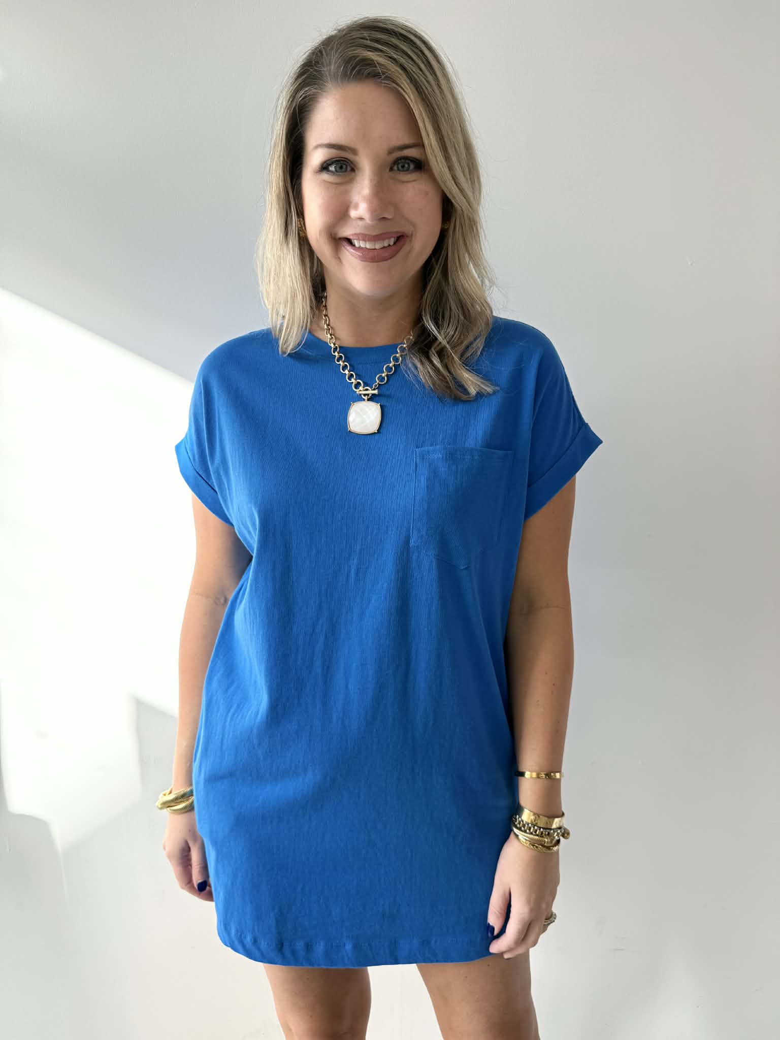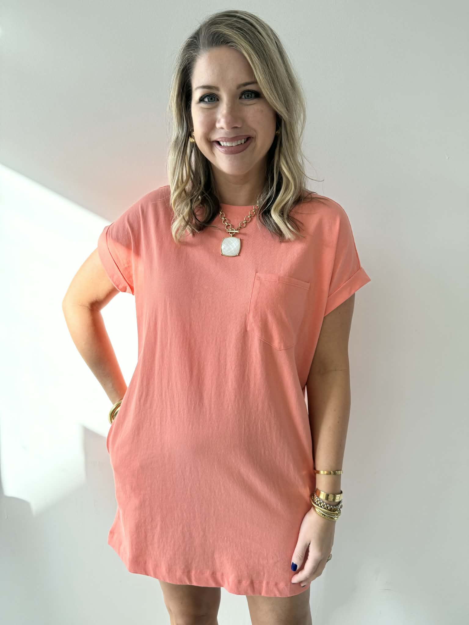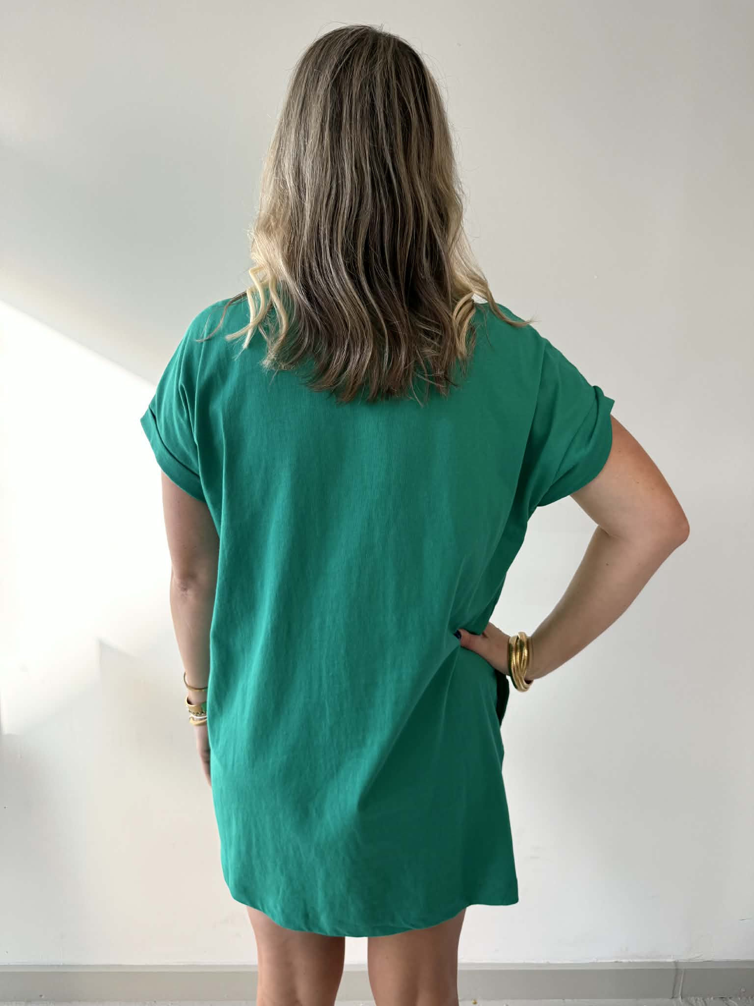 Meet your new go-to dress—soft premium cotton that hugs just right and feels amazing all day long. Adorable rolled-up sleeves give it that effortlessly chic vibe, while hidden side pockets keep your hands free and your essentials close. Simple, sweet, and endlessly wearable for everything from coffee runs to weekend adventures.