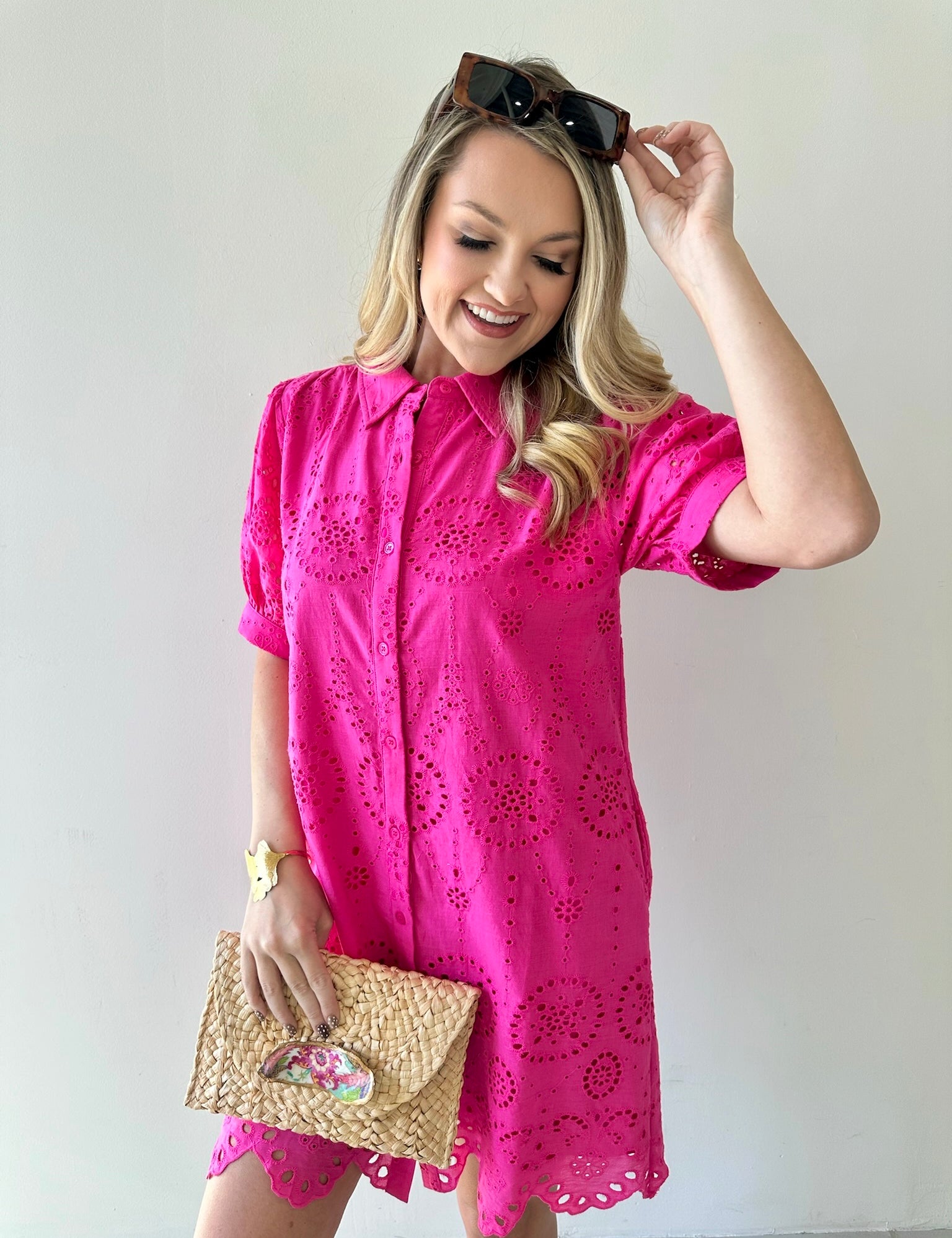 Eyelet Button Down Puff Sleeve Dress
