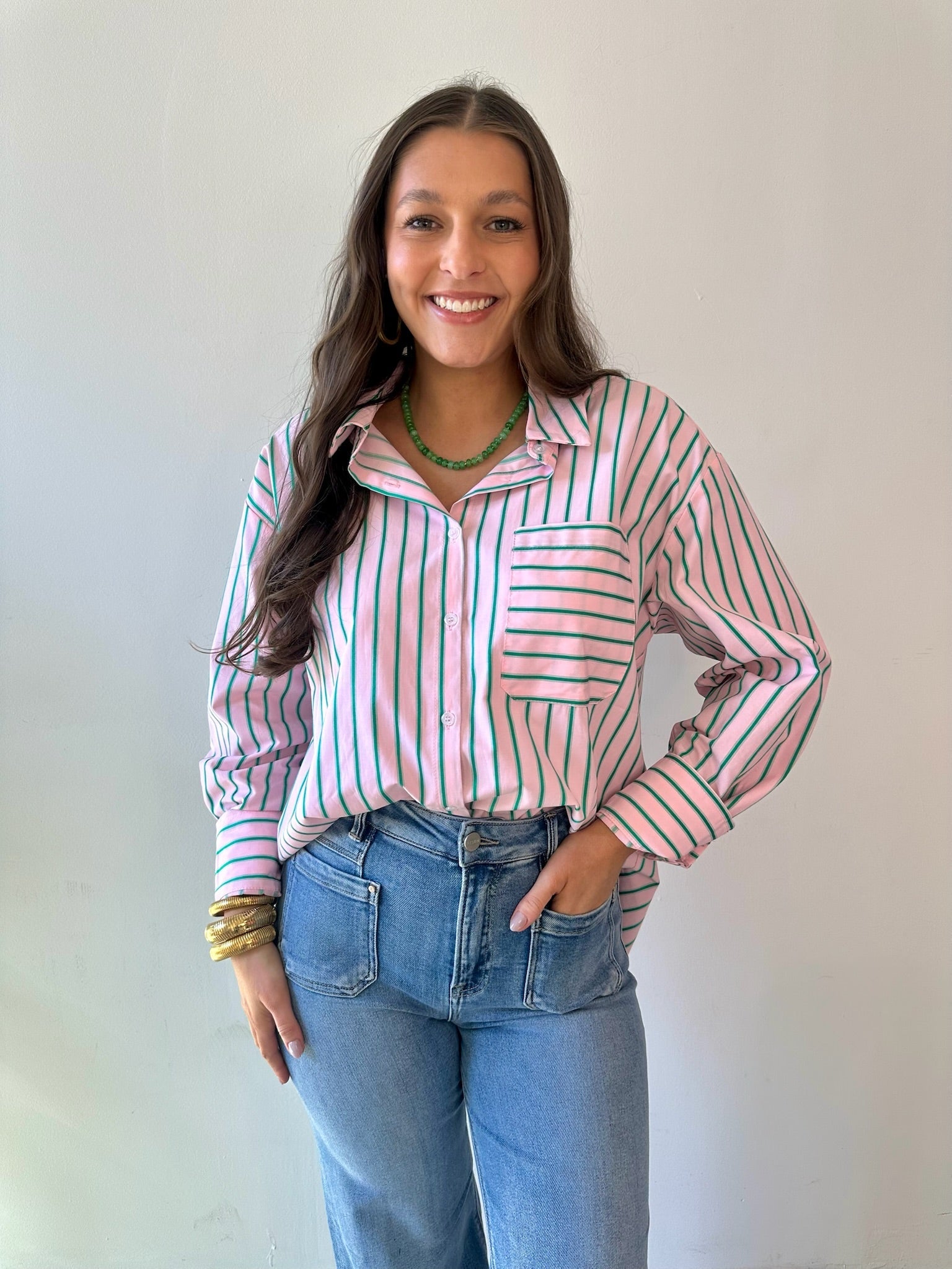 Striped Pink & Green Button Down Top