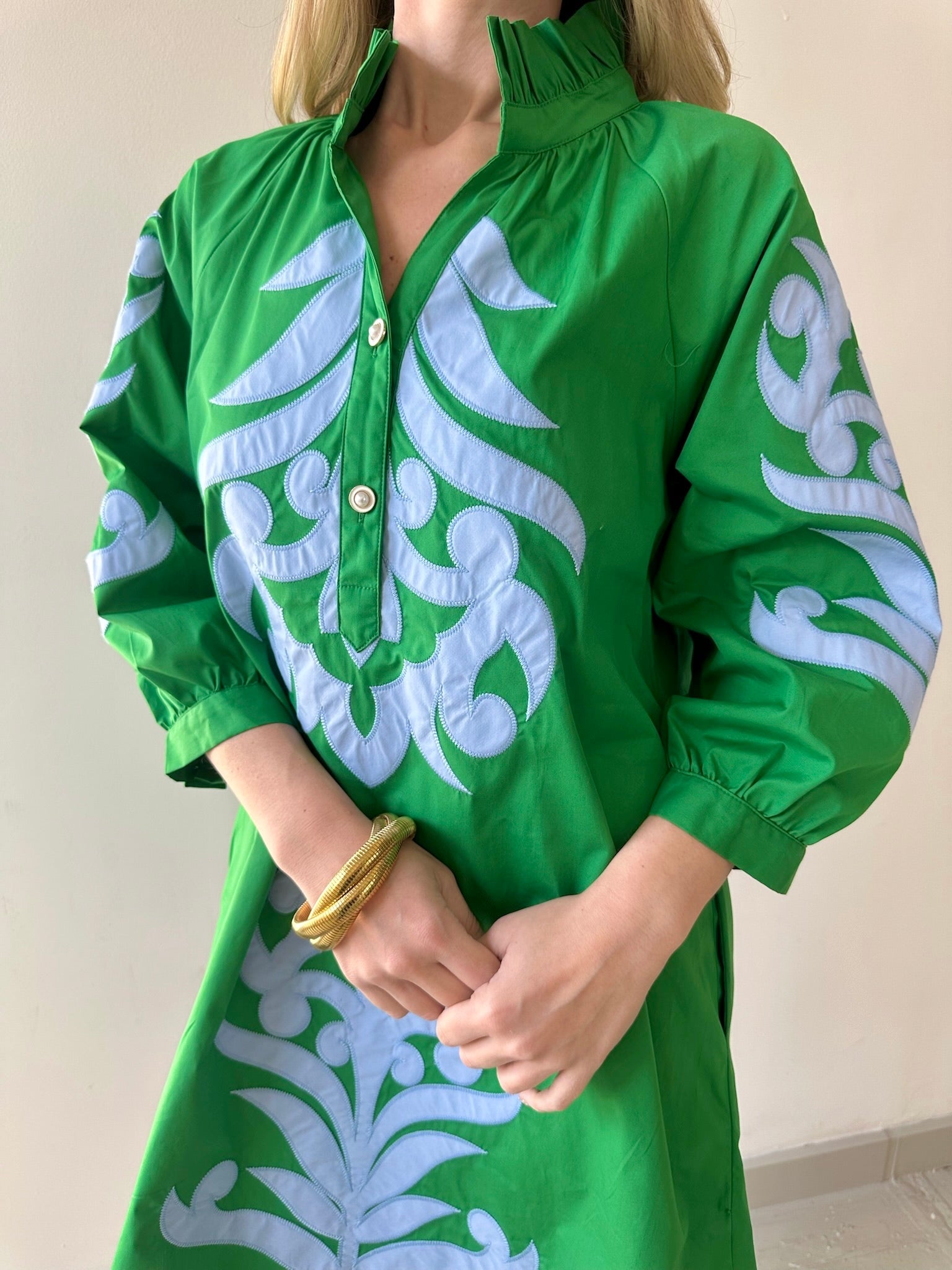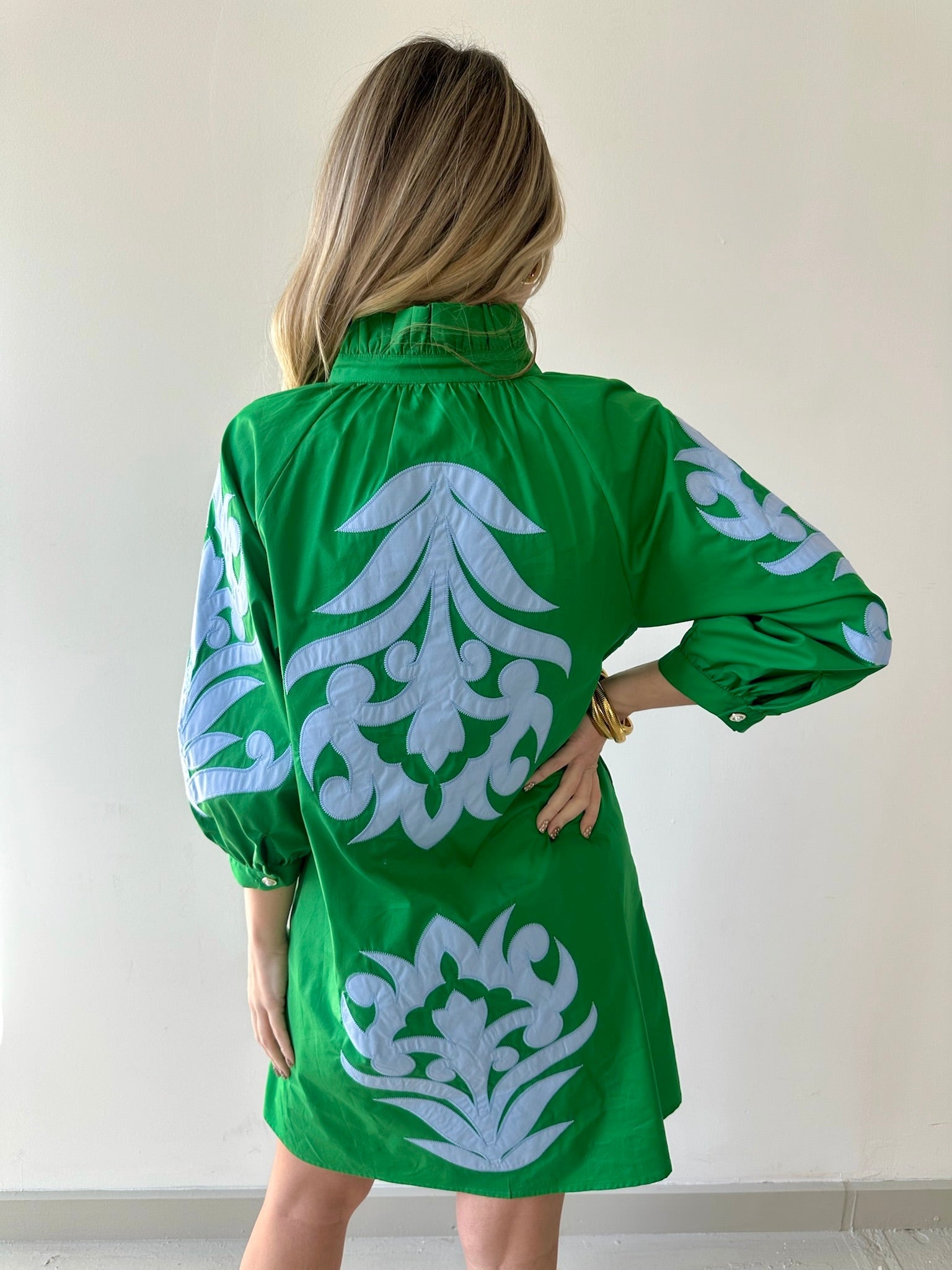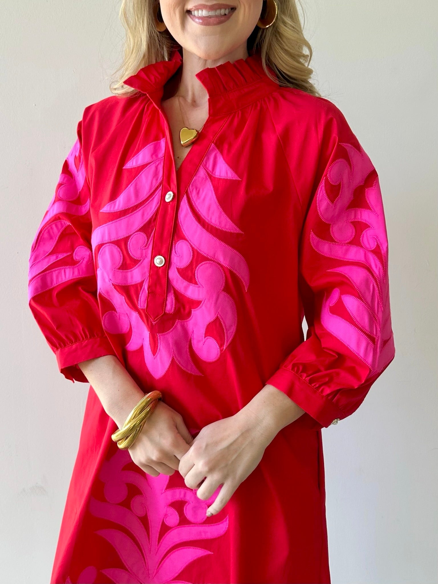 Elevate your style with the Ruffle Neck Two Tone Dress! This adorable 3/4 sleeve dress features charming baroque floral appliqués and wide pockets for added functionality. The ruffled high neckline and front button-up design create a cute, sophisticated look perfect for any occasion.