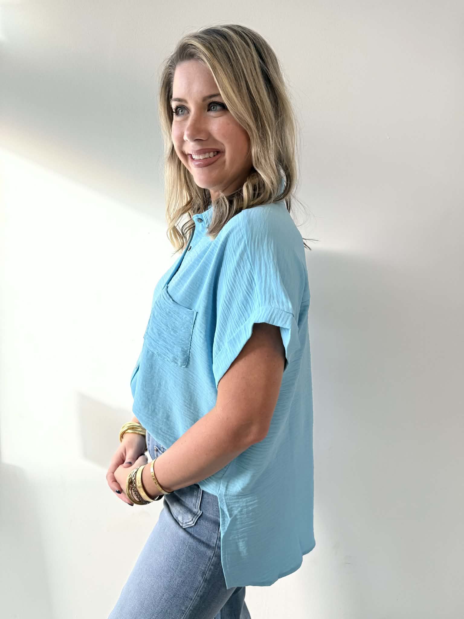 Effortlessly chic and breathable, this woven button-down features a playful hi-low hem and flattering side slits for movement and style. Perfect for layering or wearing solo, the airy fabric keeps you cool while the relaxed silhouette works from casual weekends to dressed-up occasions. A versatile wardrobe essential that feels as good as it looks.
