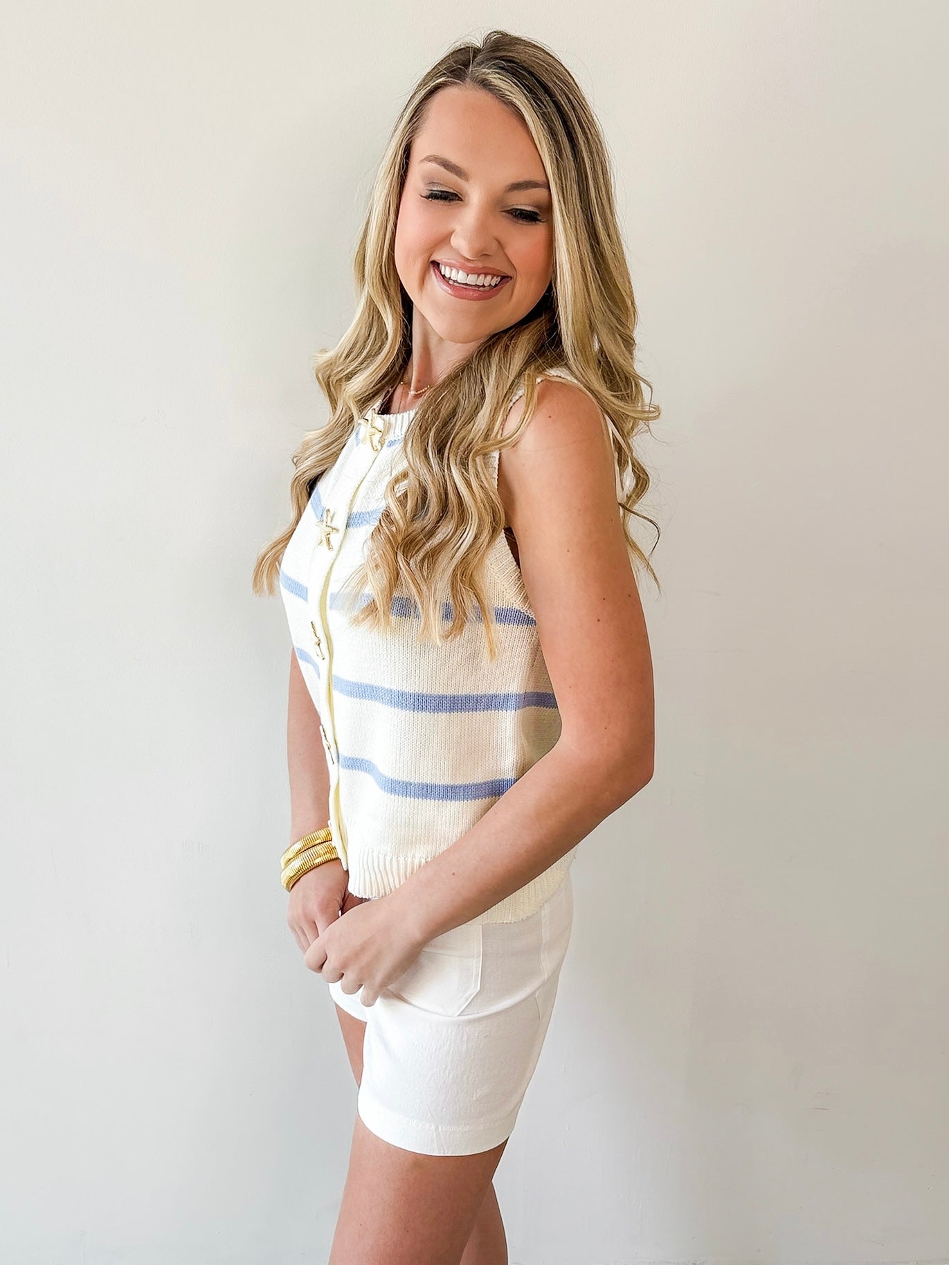 There's something timeless about a perfectly layered vest—it's the piece that transforms how you feel in your own wardrobe. This striped knit vest features delicate starfish button details that add a subtle nautical charm, making it an effortless way to elevate everyday outfits. The soft knit construction drapes beautifully over tees, tanks, or long sleeves, while the classic stripe pattern keeps it versatile enough for any season. Whether you're dressing up or keeping it casual, this vest brings understated elegance to your collection.