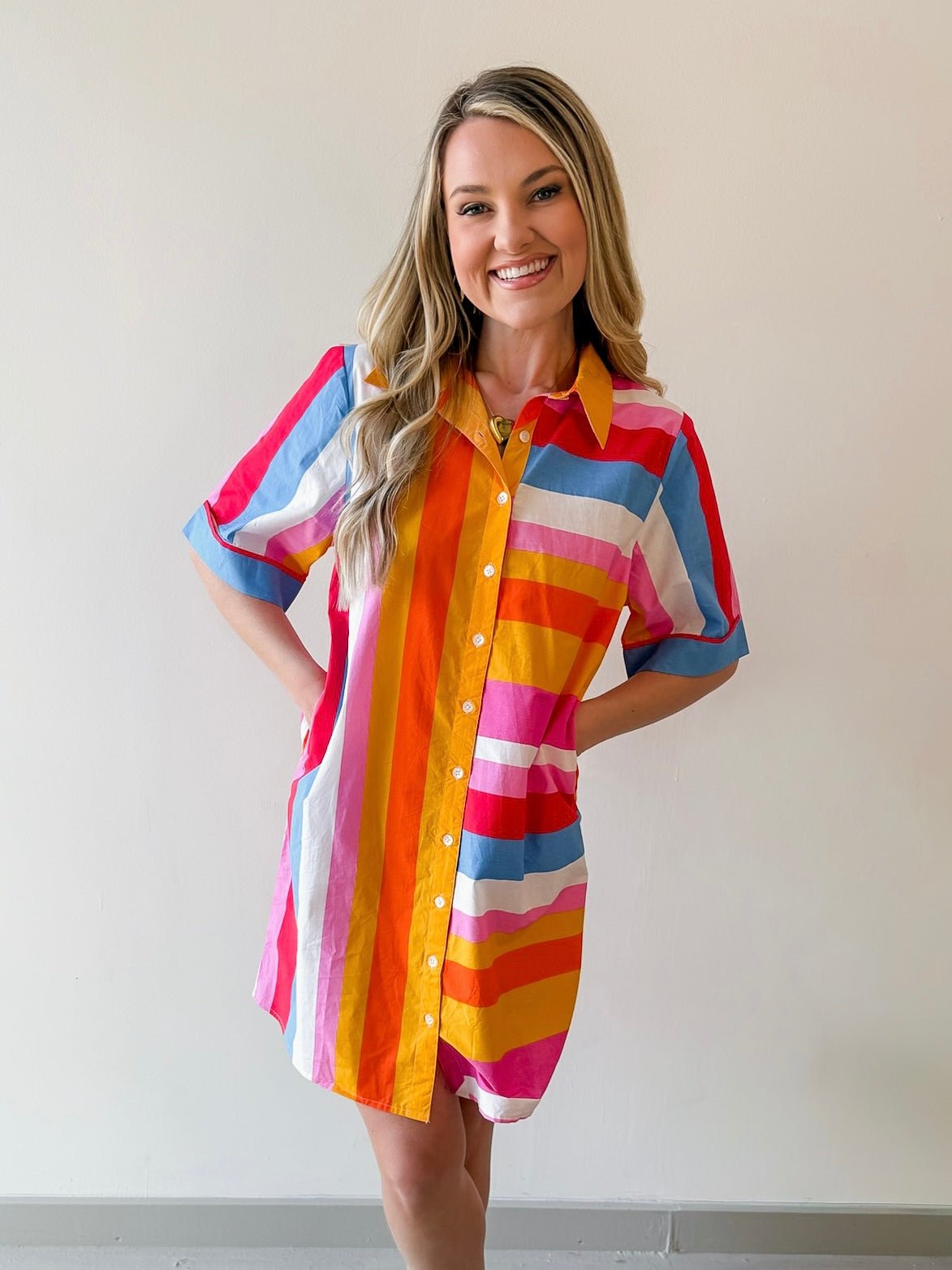Slip into effortless style with this fun striped shirt dress—a versatile piece that transitions seamlessly from casual weekends to polished weekday moments. The classic striped pattern adds visual interest while the relaxed silhouette ensures all-day comfort. Perfect for layering or wearing solo, this dress pairs beautifully with sneakers, sandals, or boots depending on your mood and occasion.