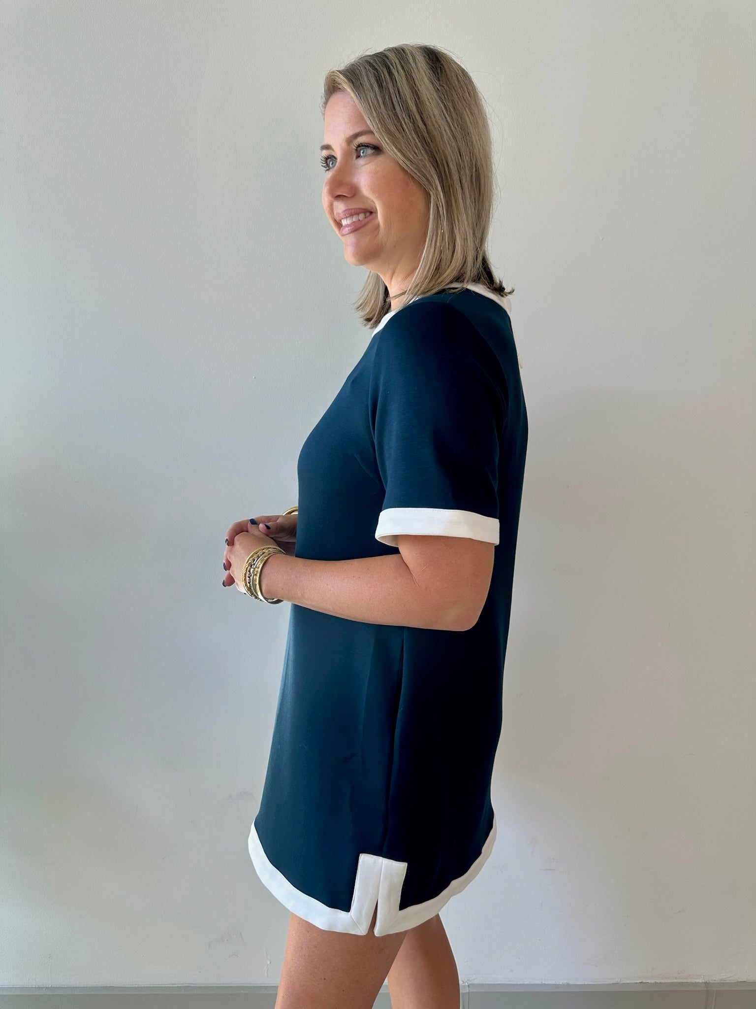 This navy dress with contrast trim is the effortless piece you'll reach for again and again, bringing that perfect balance of polished and playful to every occasion. The round neckline flatters beautifully, while the contrast trim adds a charming detail that catches the eye. Versatile enough for work, weekend outings, or casual gatherings, it's a wardrobe essential that feels both timeless and fresh. Pair it with your favorite accessories and let the dress do the talking.