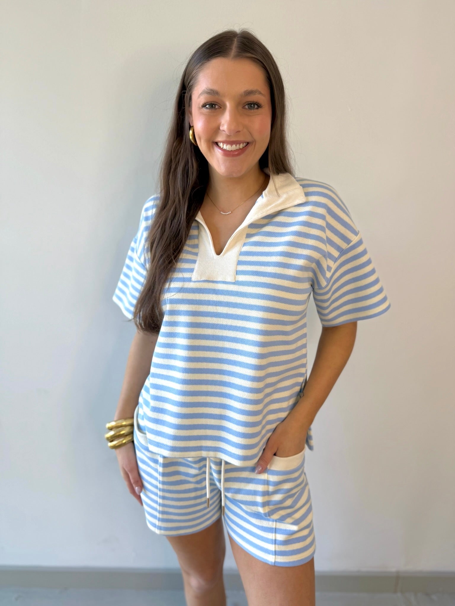There's something special about finding a set that just makes you smile—this striped knit top with its charming contrast collar paired with coordinating shorts does exactly that. The playful stripe pattern and crisp collar detail create a look that feels both polished and approachable. Crafted from soft, breathable knit fabric, it's designed for all-day comfort without sacrificing style. Perfect for creating those effortless, put-together moments.