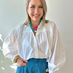 Effortlessly charming, this white blouse features a crisp basic collar and button-down front for timeless versatility. Playful balloon sleeves with tie details at the cuffs add a whimsical touch, while subtle shirring creates flattering dimension. Perfect for dressing up or down, this piece brings a delightful mix of classic and contemporary style to any wardrobe.