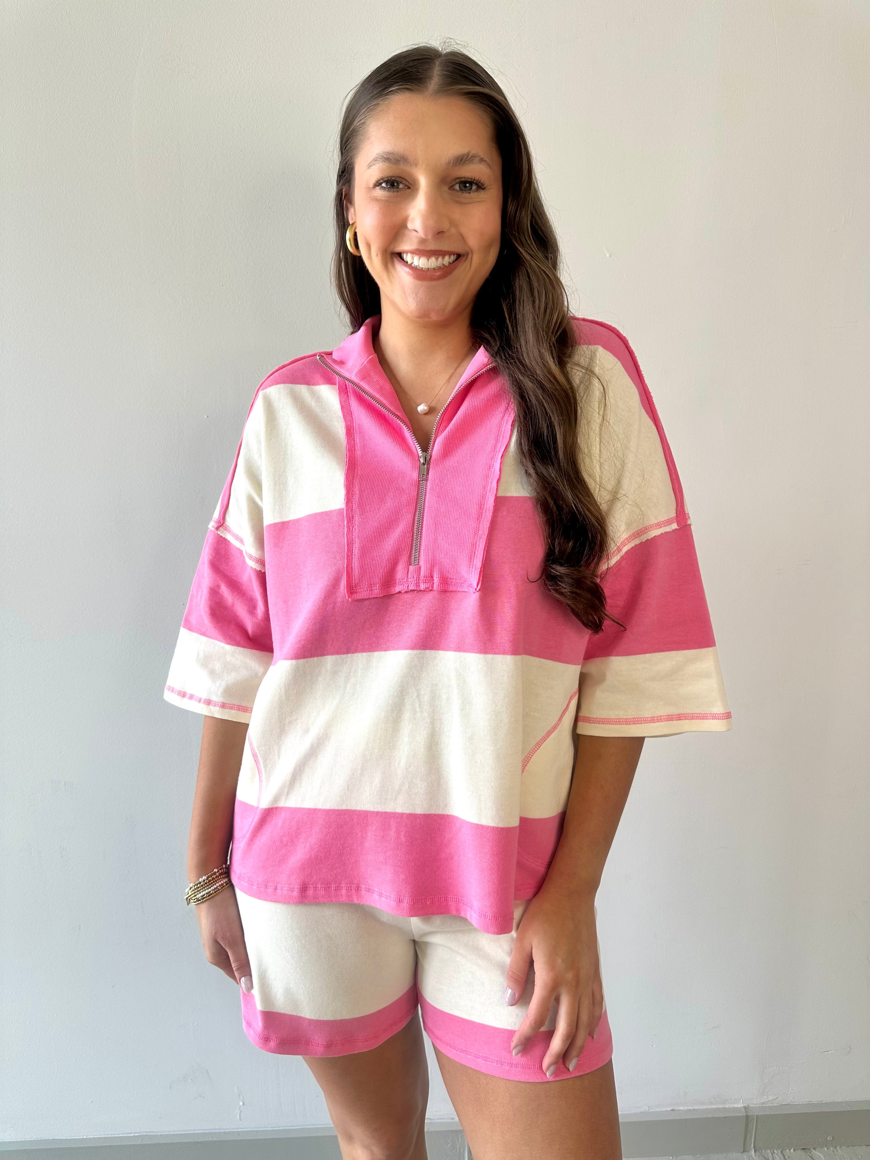 Imagine lazy afternoons and sun-kissed days in this effortlessly charming terry rugby top and short set. The soft, breathable fabric keeps you comfortable through warm weather adventures, while the classic pink and ivory colorway pairs seamlessly with your favorite sneakers or sandals. Perfect for casual outings, weekend getaways, or relaxed at-home style. A versatile essential that feels as good as it looks.
