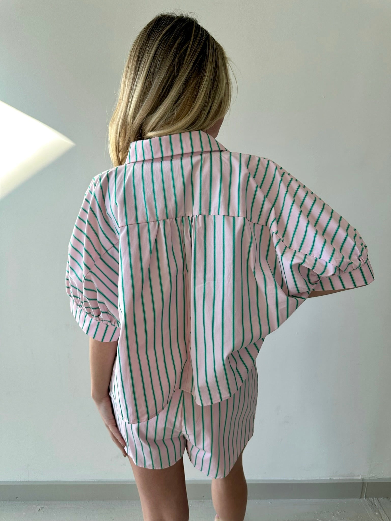 Adorable striped set featuring a boxy cropped top and matching shorts in pink and green. The relaxed silhouette is perfect for casual days when you want effortless, coordinated style. Wear together or mix with your favorites.
