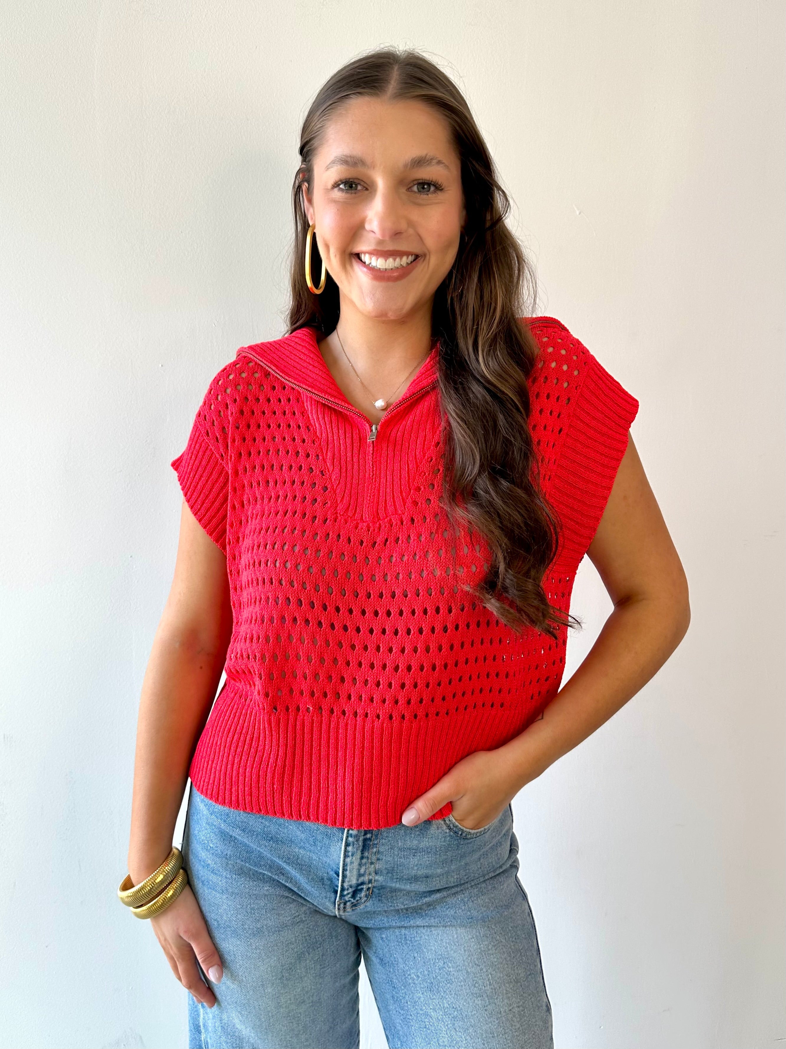 Fishnet Zip Relaxed Sweater - Red