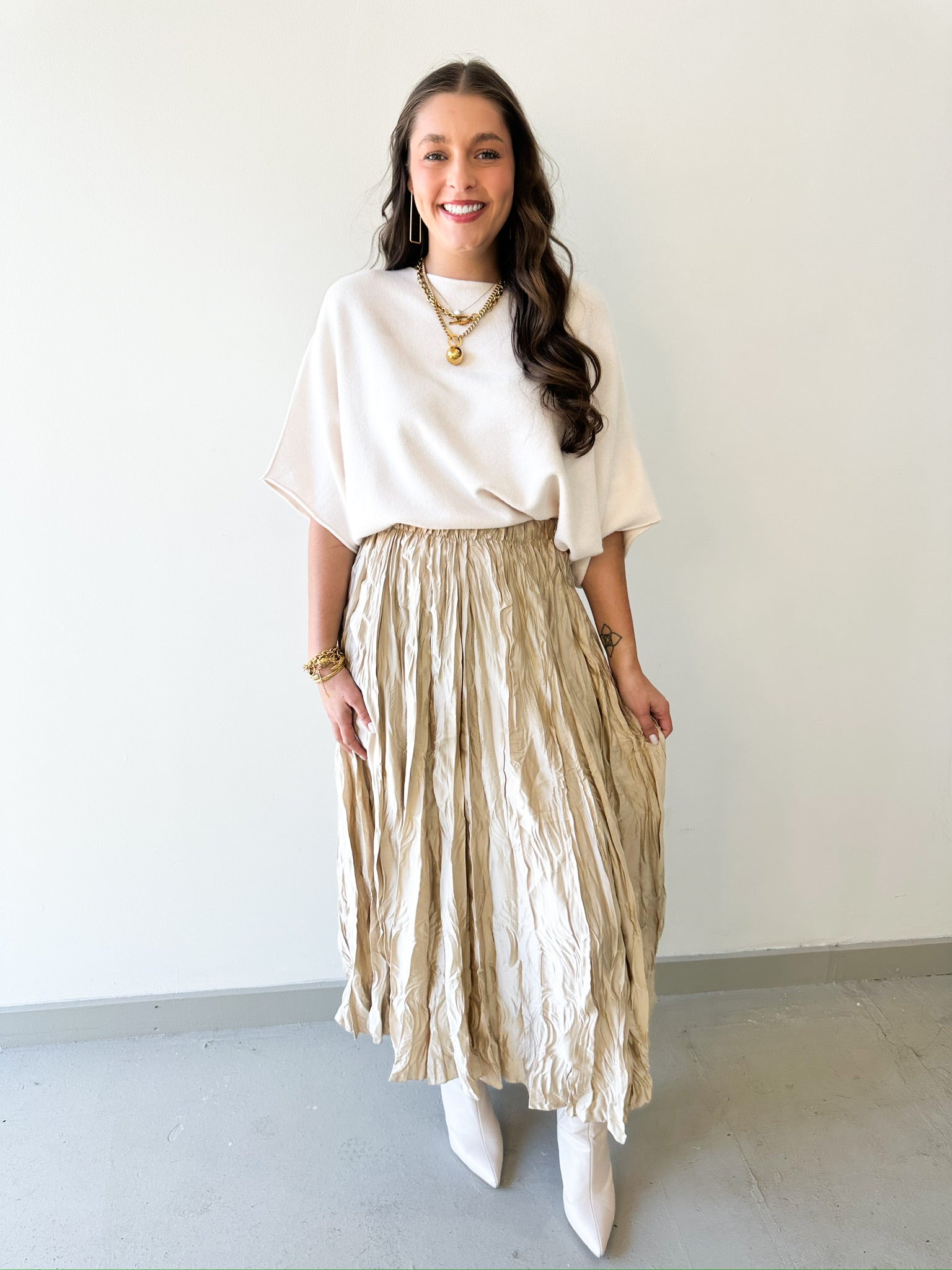 Effortlessly chic and oh-so-wearable, this crinkle beige midi skirt brings relaxed elegance to any outfit. The textured crinkle fabric adds visual interest and movement, while the midi length offers versatile styling for both casual days and dressed-up occasions. Perfect for layering with your favorite tops, this neutral staple transitions seamlessly from season to season. A wardrobe essential that feels as good as it looks.