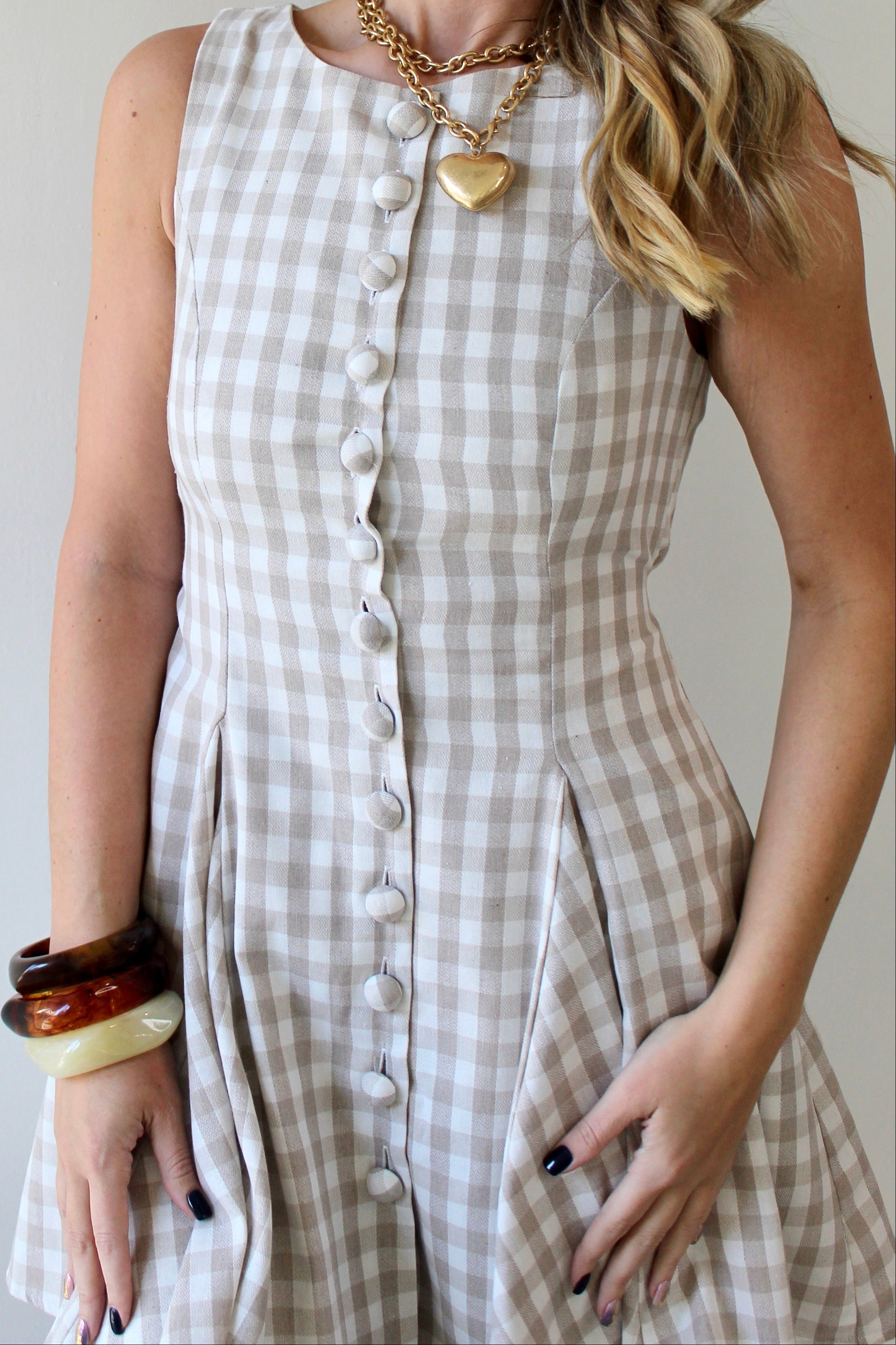 Twirl into effortless charm with this adorable gingham mini swing dress in soft beige. The classic checked pattern brings playful nostalgia, while the flattering A-line silhouette skims gracefully over your frame. Perfect for casual outings, garden parties, or whenever you want to feel like the best version of yourself. Lightweight and comfortable, this timeless piece pairs beautifully with sneakers or sandals for an instantly put-together look.