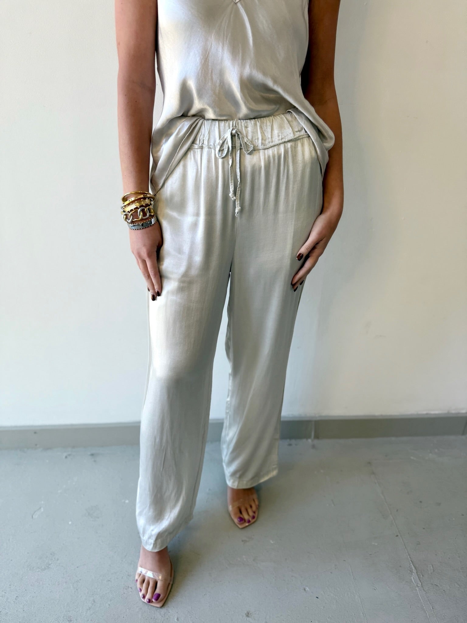 Slip into effortless elegance with these Italian silky straight leg pants in a versatile beige tone. The luxuriously smooth fabric drapes beautifully, creating a polished silhouette that transitions seamlessly from casual coffee dates to sophisticated evening events. Mix and match with your favorite tops and accessories to craft endless outfit combinations. A wardrobe essential that feels as good as it looks.
