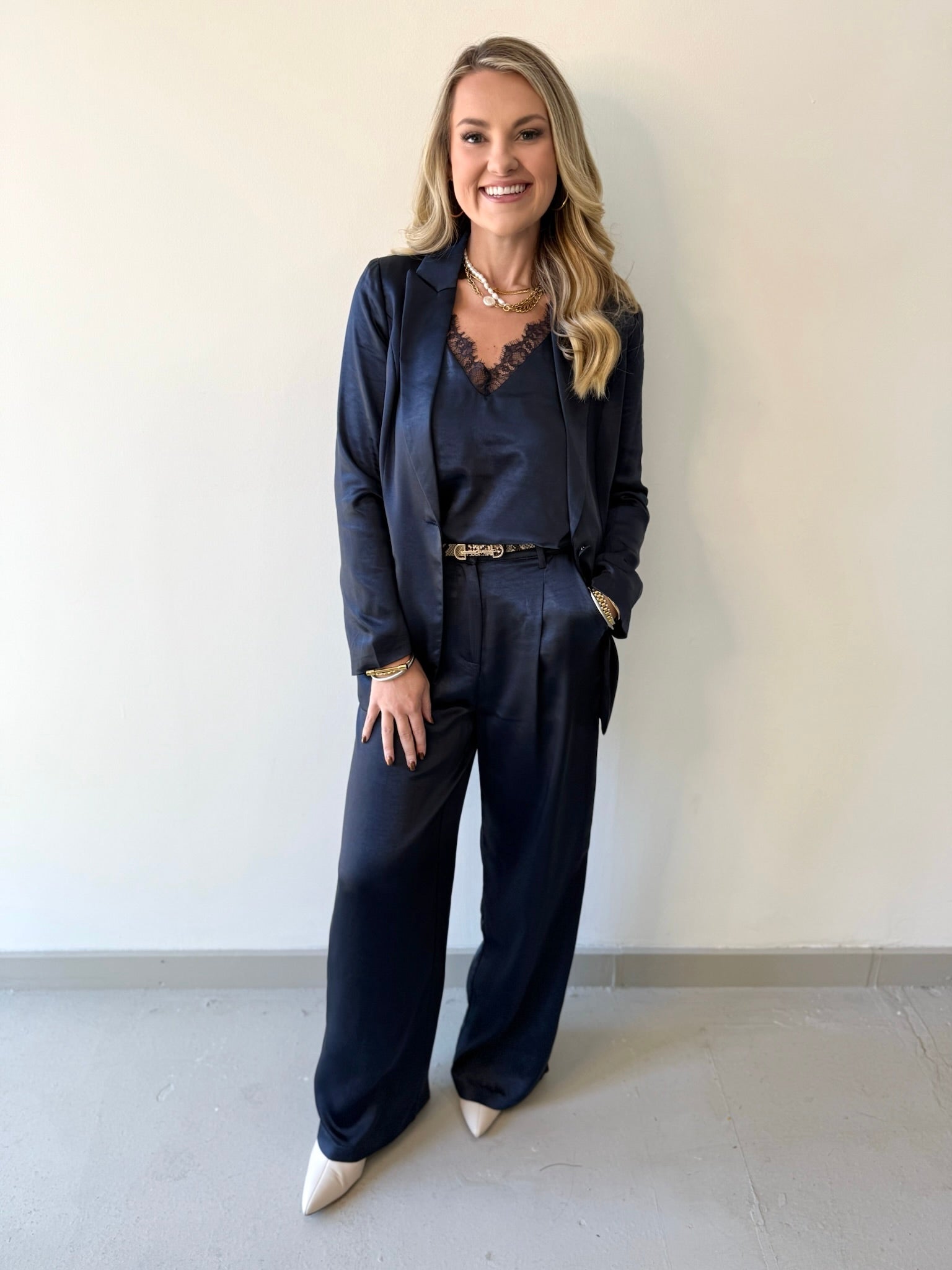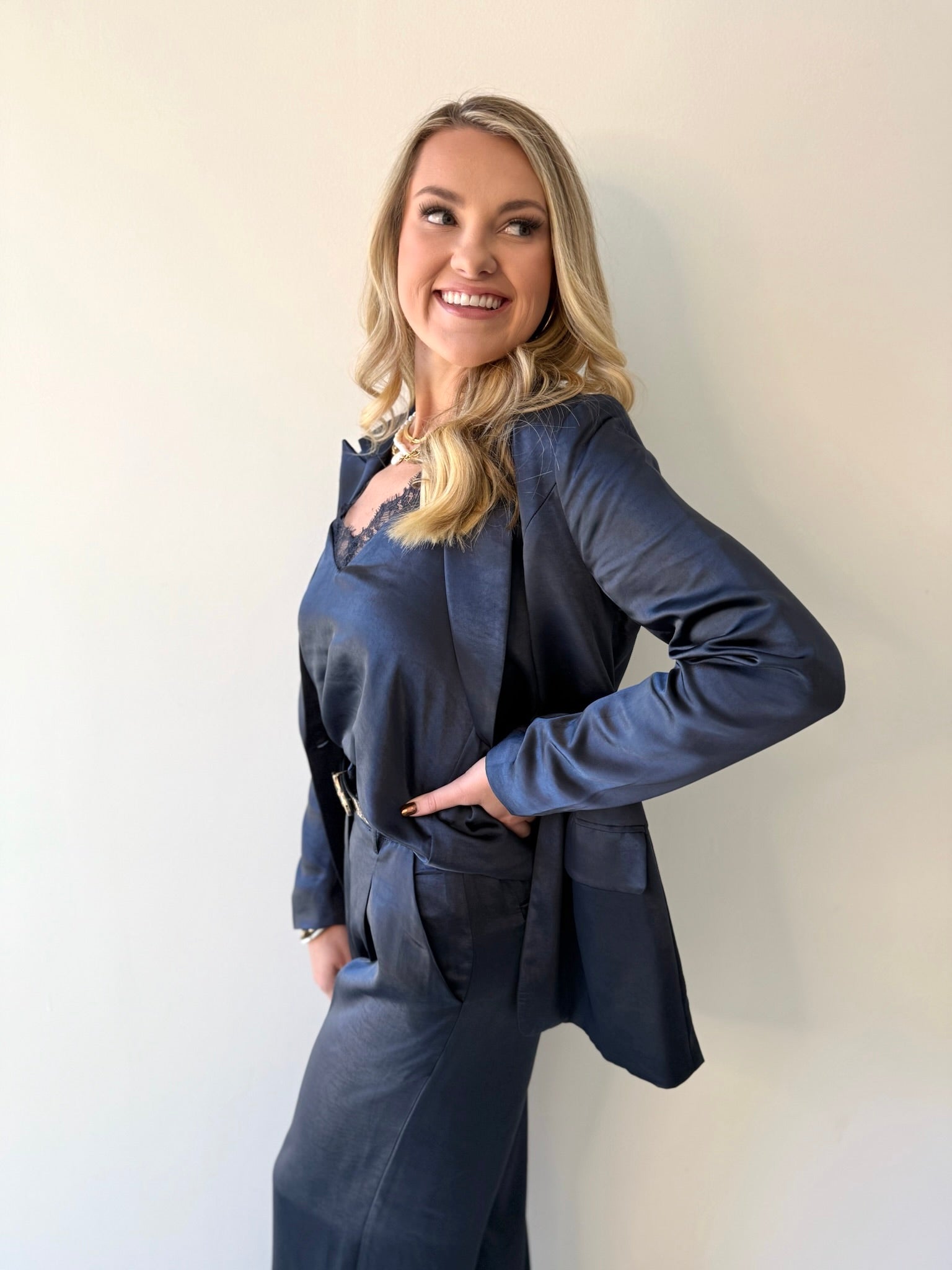 Elevate your look with the Evelyn Satin Blazer in navy. This charming blazer blends silky smooth satin with a tailored fit, adding a touch of elegance and playful sophistication to any outfit. Perfect for dressing up your everyday style or shining at special occasions, it’s a cute and chic layer you'll reach for again and again.