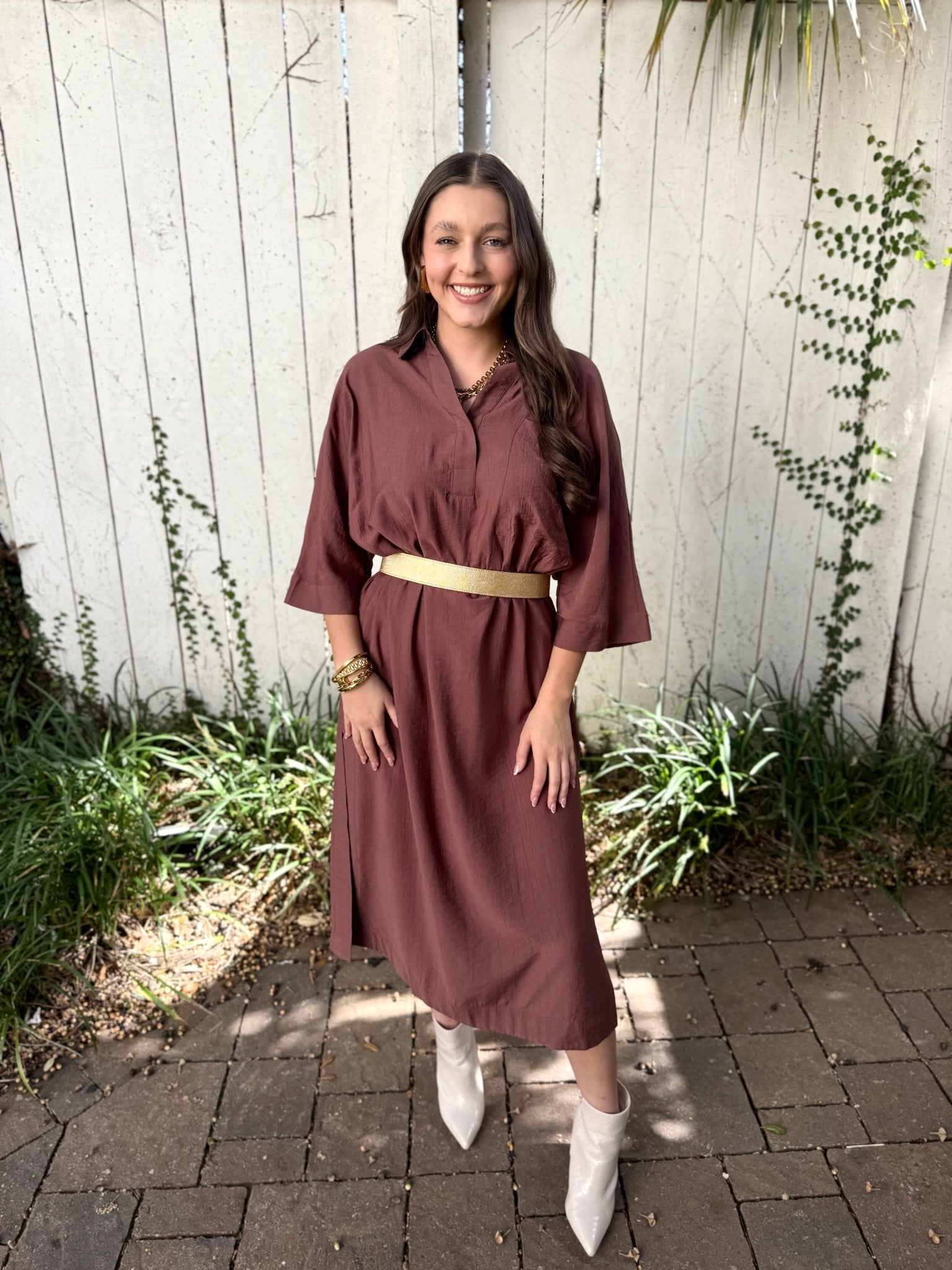 This adorable brown midi dress combines comfort and style with its solid color and lightweight woven fabric. Featuring a charming collared V-neck and a chest pocket, it adds a touch of playful detail while the snap button closure at the bust makes it easy to wear. Practical side pockets keep essentials close, and the unlined design ensures breathability—perfect for everyday outings or casual gatherings. Embrace effortless cuteness in a dress that’s as comfy as it is cute!