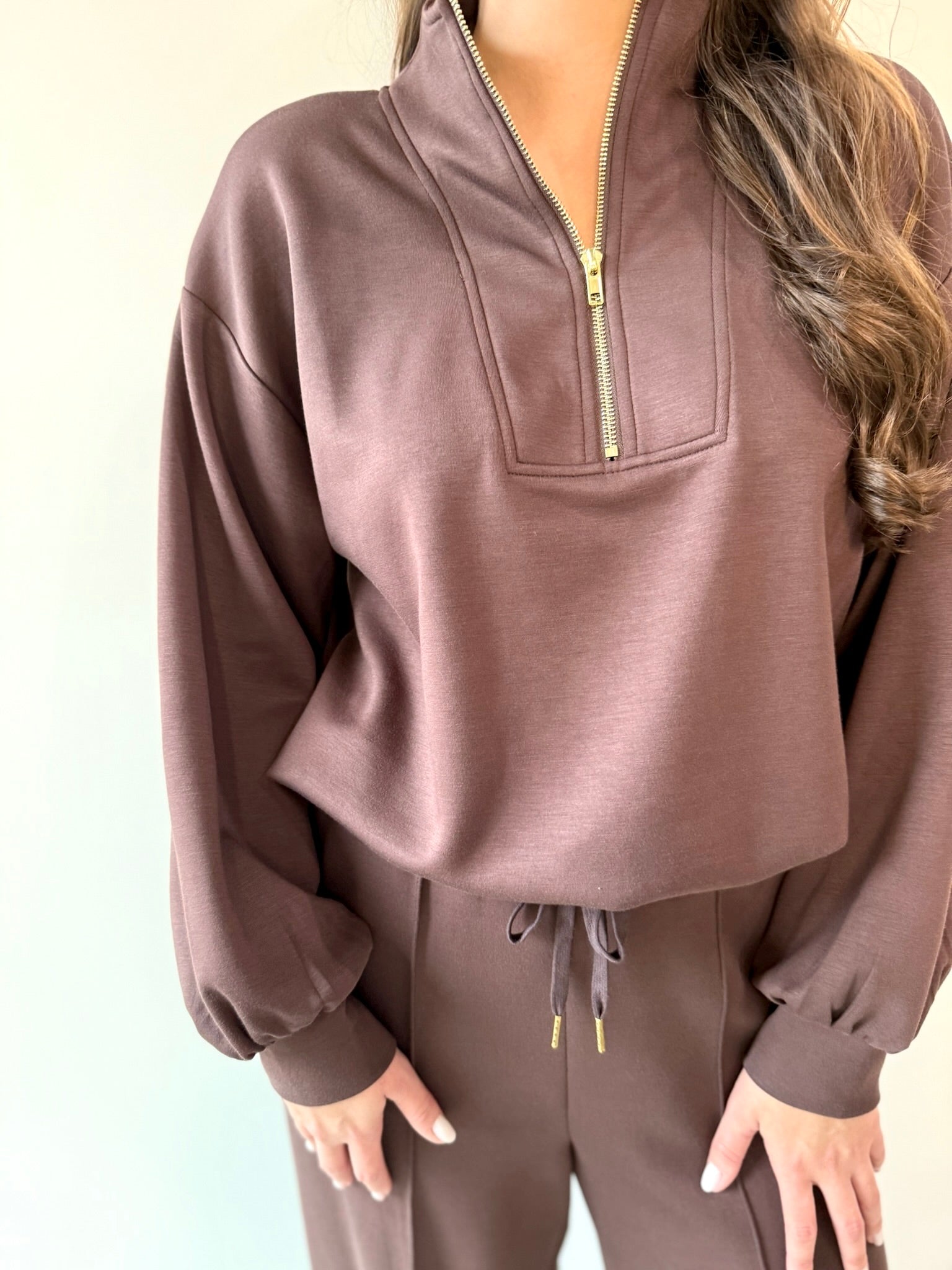 Stay cozy and stylish with the Hannah Half Zip Top & Pant Set in Espresso. The long sleeve knit top features a chic stand collar with a handy half zip, perfect for layering. Paired with wide-leg knit pants that offer a comfy drawstring waist and handy side pockets, this lightweight, non-sheer set is your go-to for effortless comfort and cute vibes all day long.