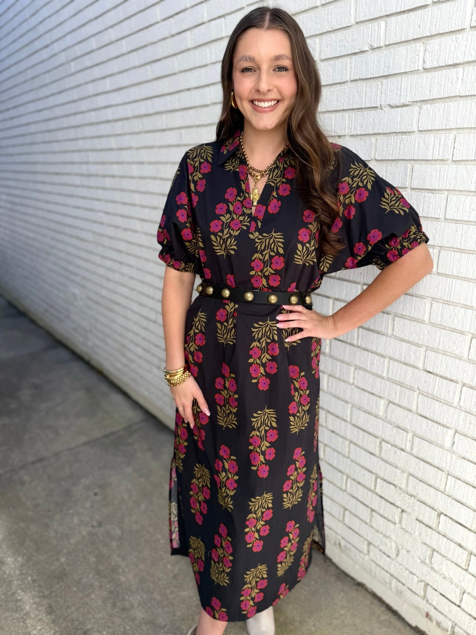 This charming Botanical Puff Sleeve Midi Dress combines a playful puff sleeve with a flattering split neck and collar for a sweet, feminine look. Lightweight and fully lined, the woven fabric ensures comfort without sheerness. Practical side pockets add a fun and functional detail, making it perfect for day-to-night wear.
