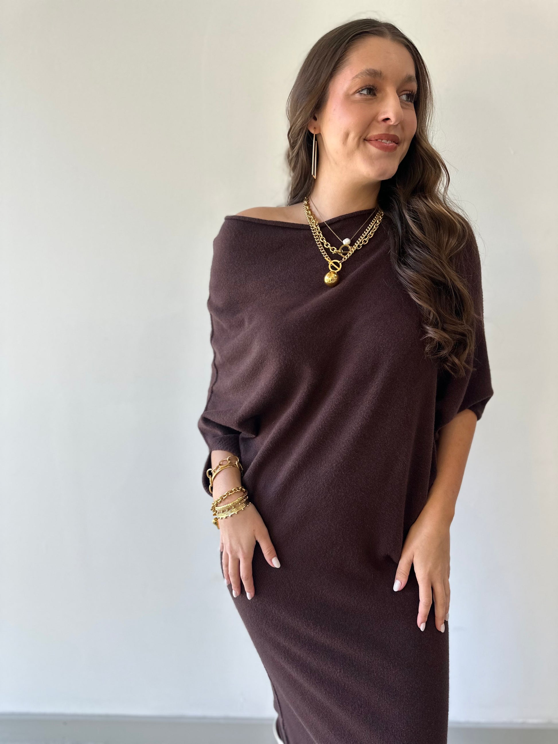 Wrap yourself in effortless elegance with this asymmetrical sweater dress that transforms your everyday moments into something special. The thoughtfully angled hemline creates a flattering silhouette while the rich brown tone pairs seamlessly with your favorite boots and accessories. Soft, cozy knit fabric makes it perfect for layering through seasons, whether you're heading to brunch or settling in for a quiet evening. A versatile piece that feels as good as it looks.