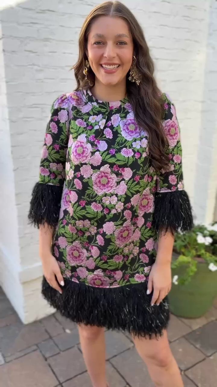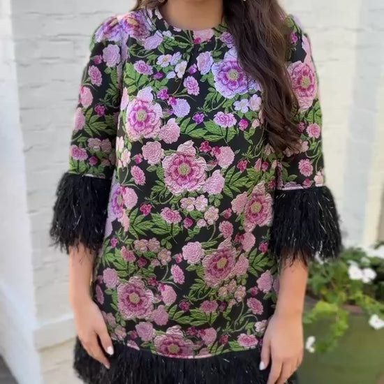 This enchanting dress is designed to make you feel absolutely radiant at every special moment. It features a round neckline and playful half sleeves that frame your silhouette beautifully. Delicate ostrich feather fringes adorn the cuffs and hem, adding whimsical texture and movement. Crafted from floral jacquard woven fabric, it brings subtle elegance to your look. A charming button and loop closure completes this sweet ensemble perfect for any special occasion.