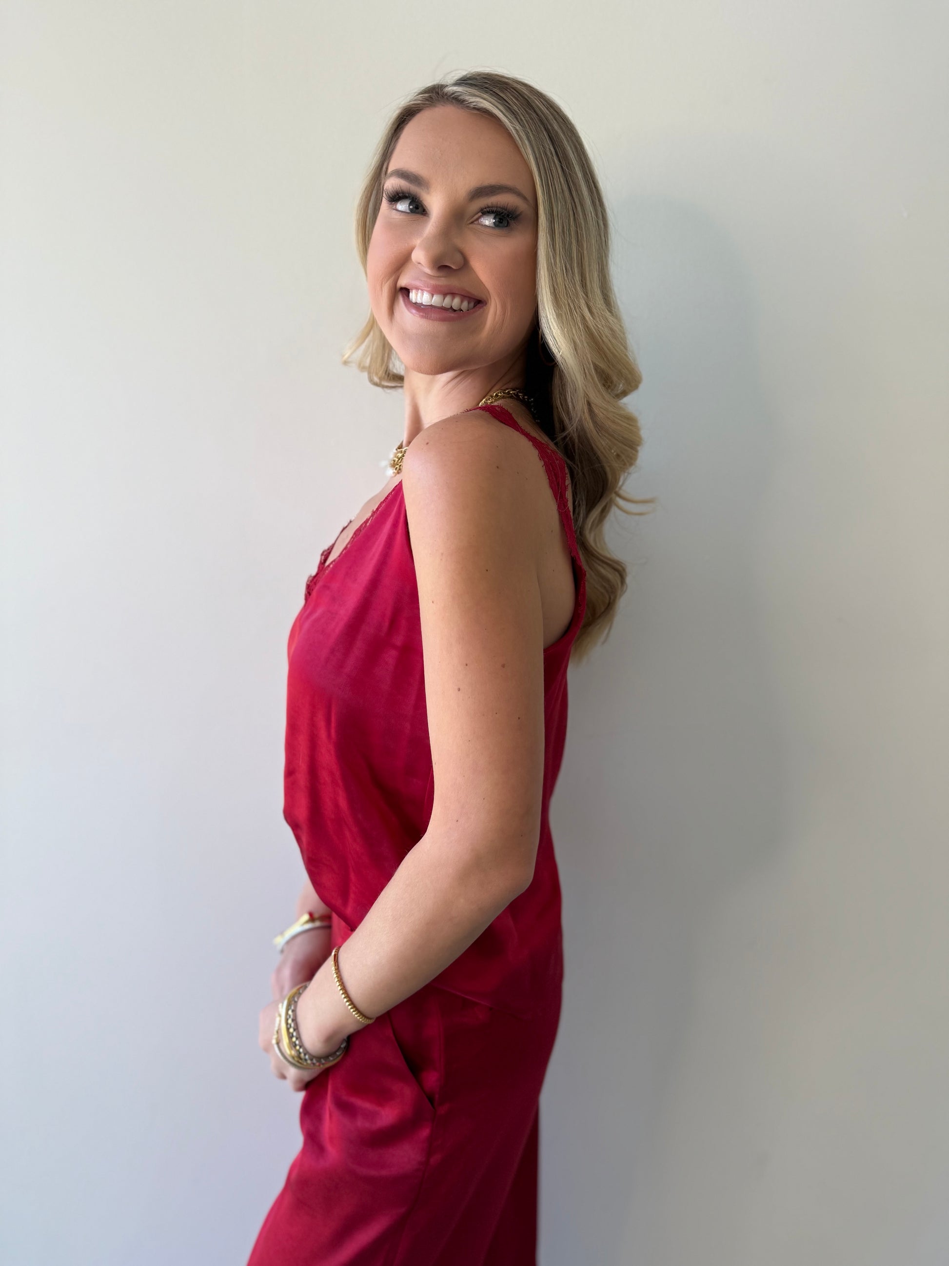 This sleeveless satin sheer top in red features delicate lace trim for a charming, feminine touch. Its lightweight fabric offers a soft, breezy feel perfect for layering or wearing on its own during warmer days. The elegant design pairs effortlessly with jeans or skirts to create a cute, effortless look.
