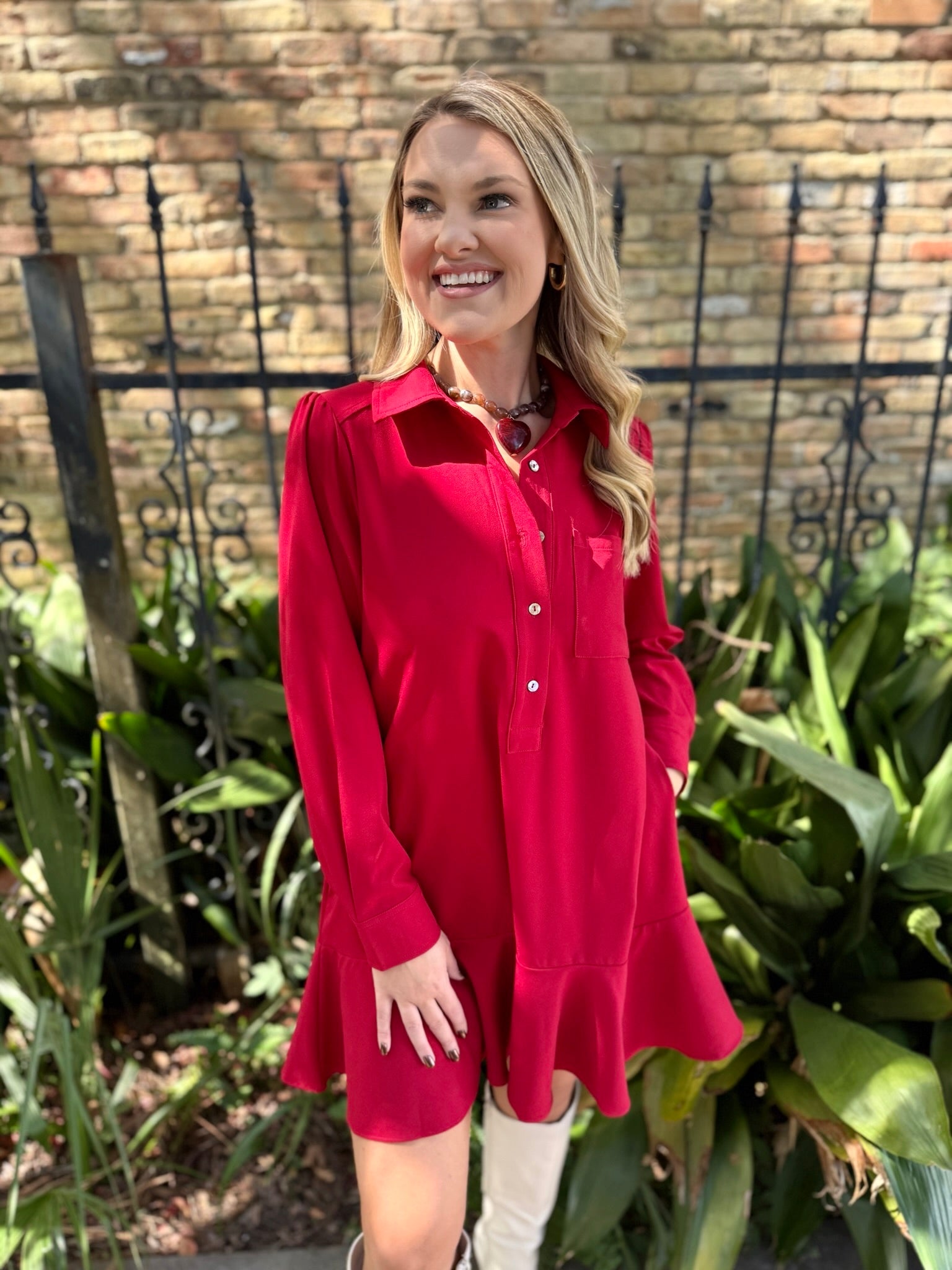 This charming mini dress features long sleeves with a classic button-down front. The solid wine color creates a flattering silhouette, while playful ruffle detailing at the hem adds a touch of flirty fun. Practical side and chest pockets blend style with convenience, perfect for keeping essentials close. Ideal for a cute, casual look that effortlessly balances comfort and feminine charm.