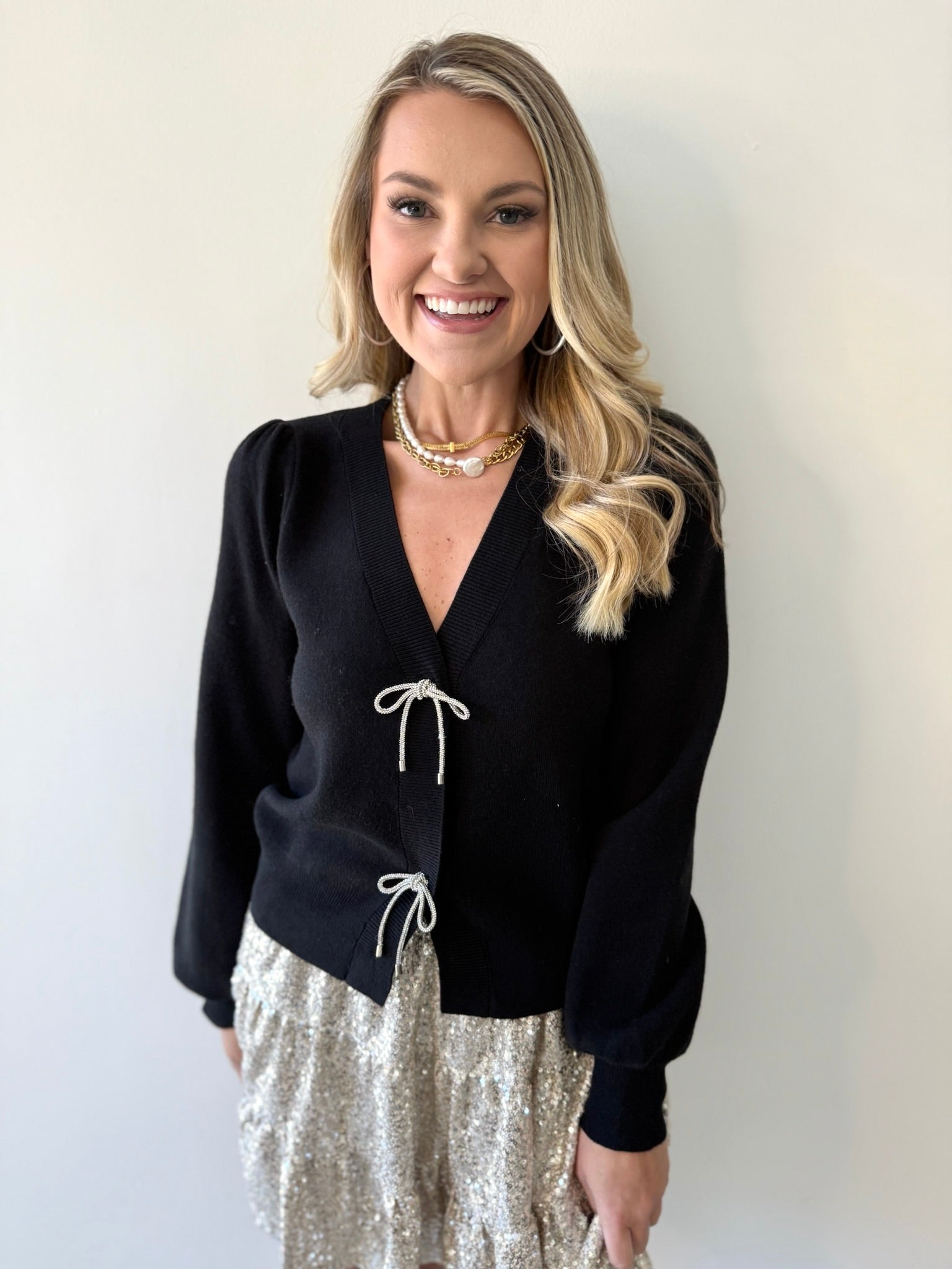 This delightful black cardigan combines softness with sweet details like puff sleeves and delicate ribbon trim, adding a charming, feminine touch to your wardrobe. Its cozy knit fabric makes it perfect for layering over dresses or pairing with high-waisted bottoms, creating a romantic and effortlessly cute look for any occasion.