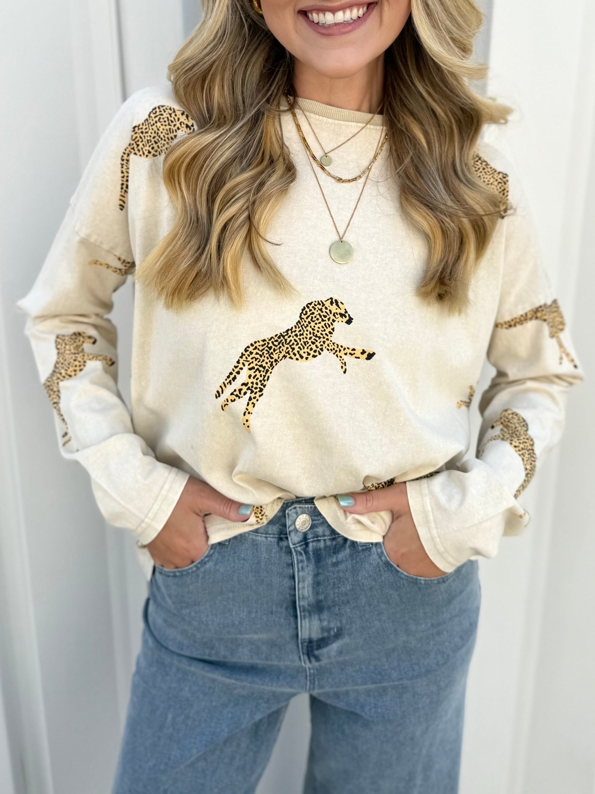 Add a playful touch to your wardrobe with this Mineral Wash Cheetah Print Long Sleeve Top. Its soft, mineral-washed fabric offers cozy comfort all day, while the trendy cheetah print brings fun, wild style to any look. Perfect for layering or wearing solo, this top effortlessly pairs with jeans or leggings for a cute, casual outfit.