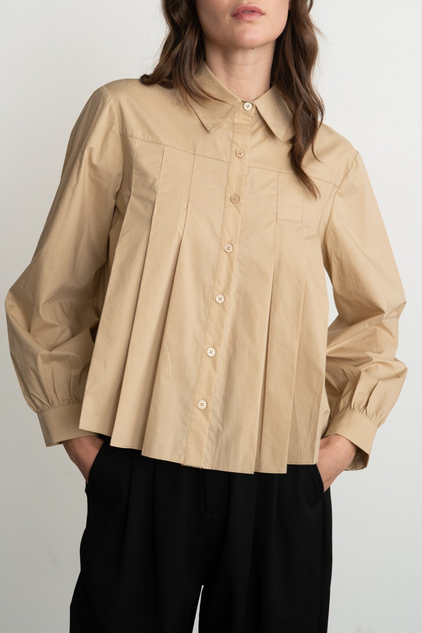 This pleated poplin button-down shirt blends sweet style with classic charm. Its delicate pleats add a playful touch, while the crisp poplin fabric keeps it fresh and polished. Perfect for layering or wearing on its own, it’s an easy way to stay cute and chic all day.