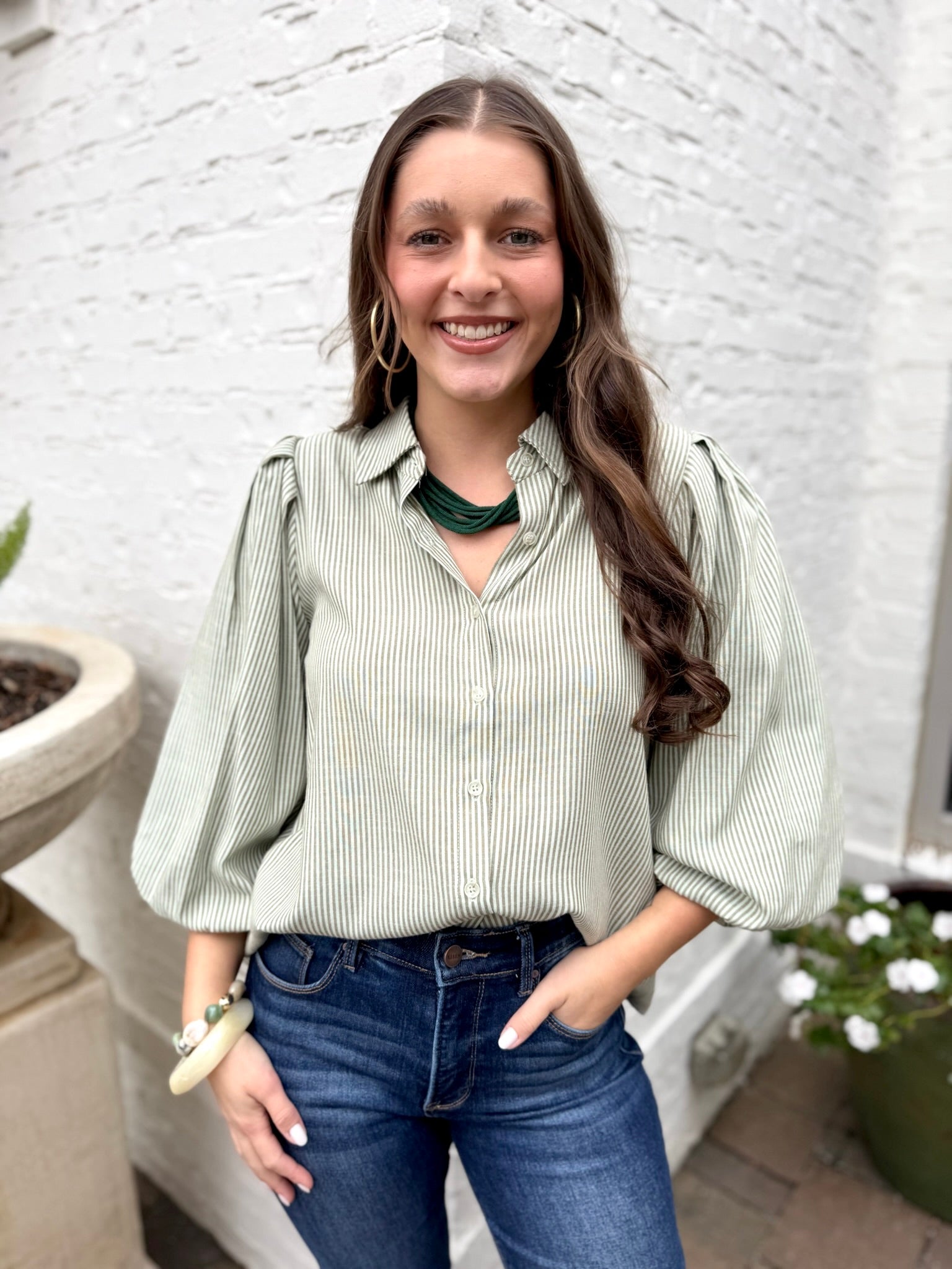 Adorable striped top featuring charming 3/4 puff sleeves that add a playful touch to your wardrobe. The front button-down design offers easy styling versatility, while delicate pleating along the shoulder line creates dimension and visual interest. Perfect for casual outings or dressing up with your favorite accessories. This mint hue brings a fresh, cheerful vibe to any outfit.