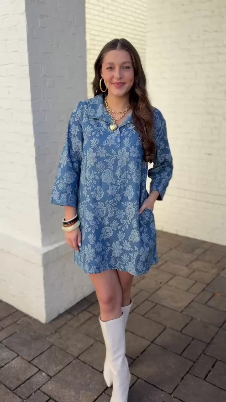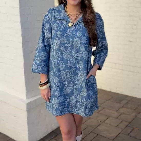 Slip into effortless style with the Rainey Floral Denim Dress. Soft denim meets a cheerful floral print, while 3/4 sleeves and a collared neckline keep things polished. Side pockets add practicality to the mix, making this your new favorite for casual days that call for a little extra charm.