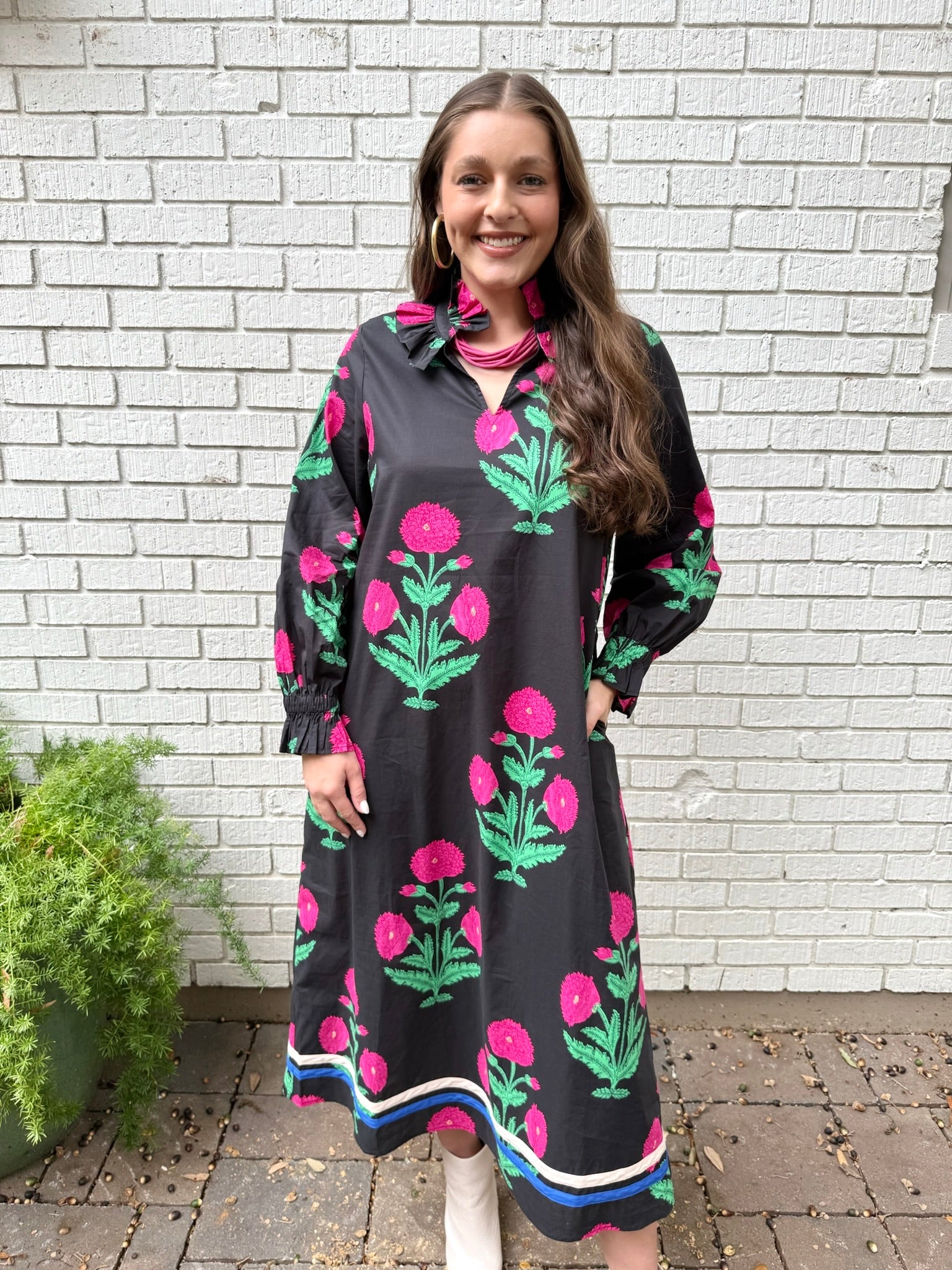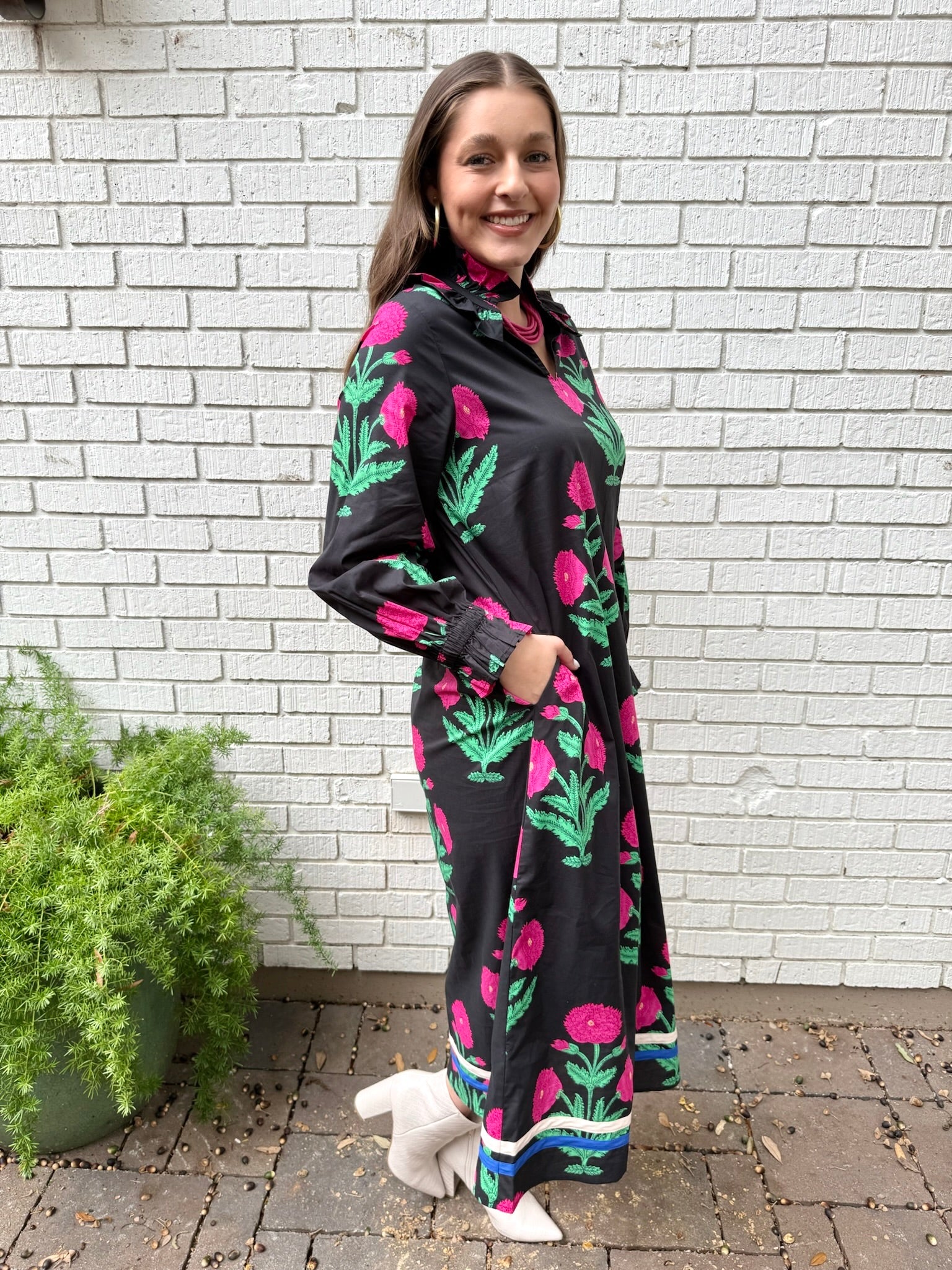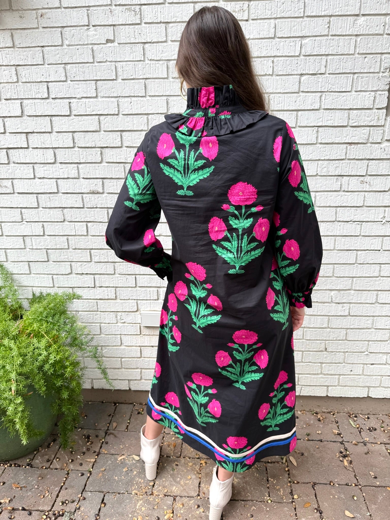 Elevate your everyday style with this charming ruffled high neck midi dress in classic black. The delicate ruffled detailing adds a playful touch, while the high neckline offers a sophisticated silhouette. Perfect for brunch dates, casual outings, or dressing up with accessories, this versatile piece transitions seamlessly from day to night. The midi length provides an elegant, flattering fit that works for any season. A wardrobe essential that's both timeless and fun.