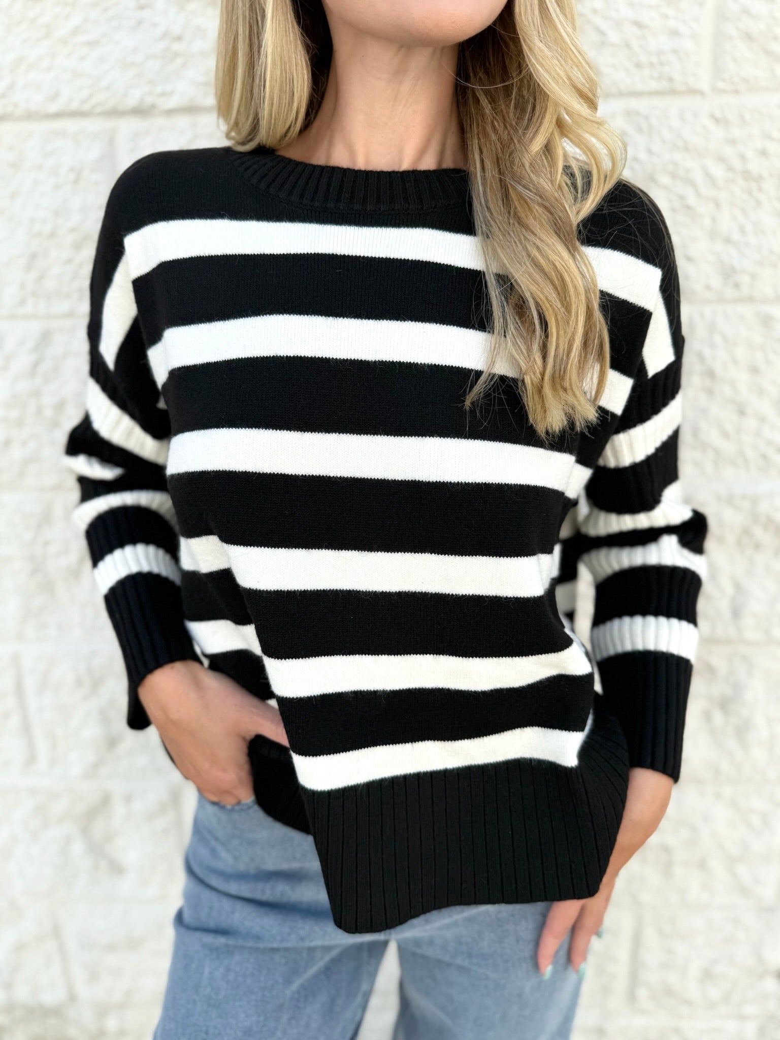 Enjoy extra comfort and style with this oversized knit sweater featuring cozy ribbed stripes. Its relaxed fit makes it perfect for lounging or casual outings, while the playful stripe pattern adds a cute, laid-back touch to your everyday look.