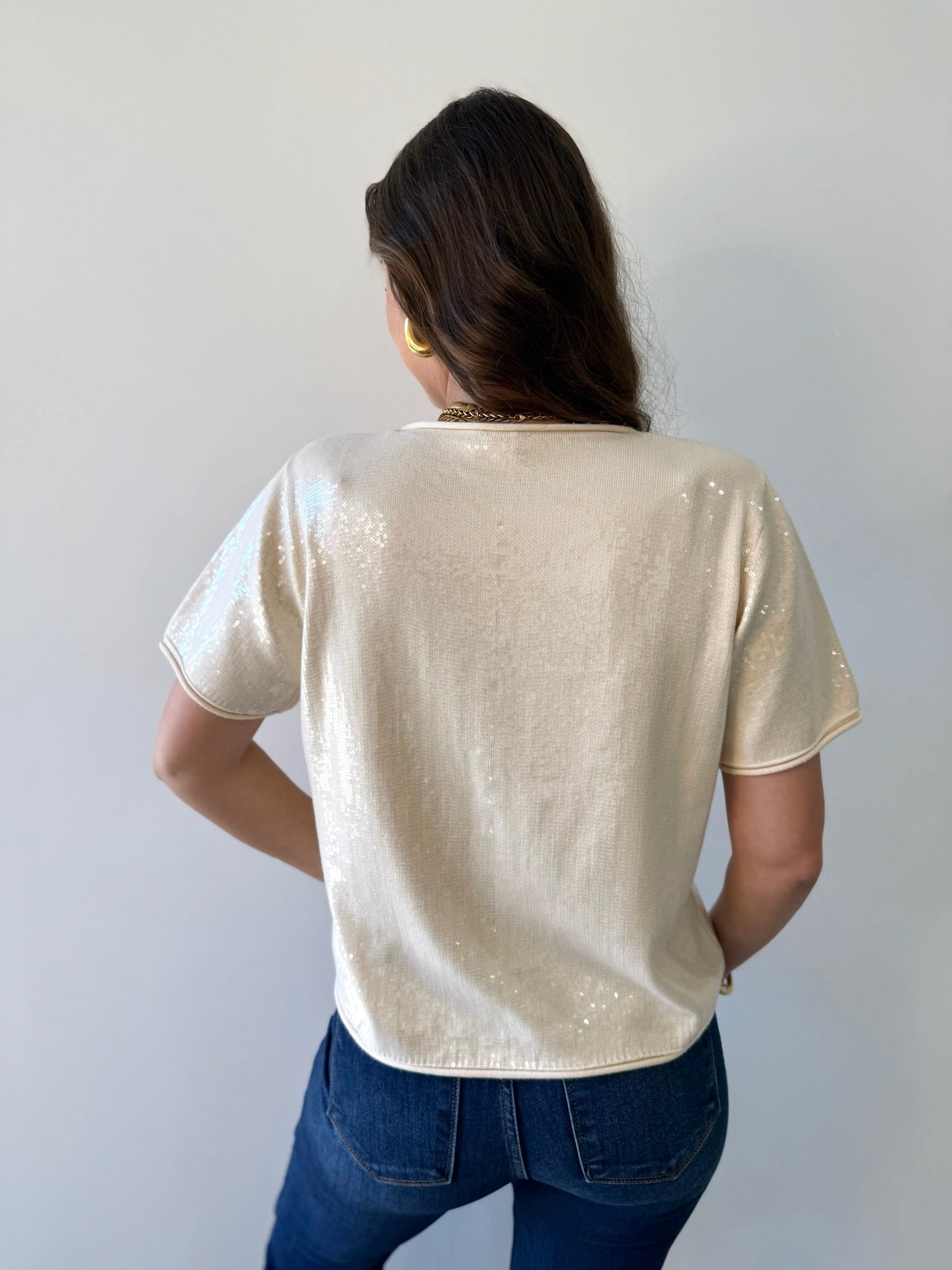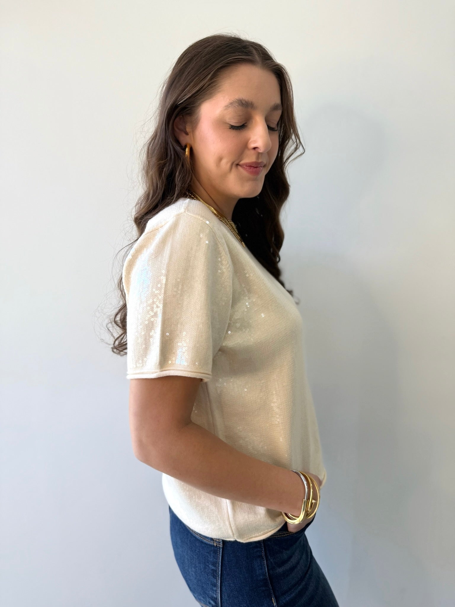 This cream knit top glistens with delicate tiny sequins for a sweet and subtle shine. The raw-cut edge detail adds a fun, carefree touch, making it an adorable choice to brighten up your everyday wardrobe. Soft, cozy, and effortlessly cute, it’s perfect for adding sparkle to any look.